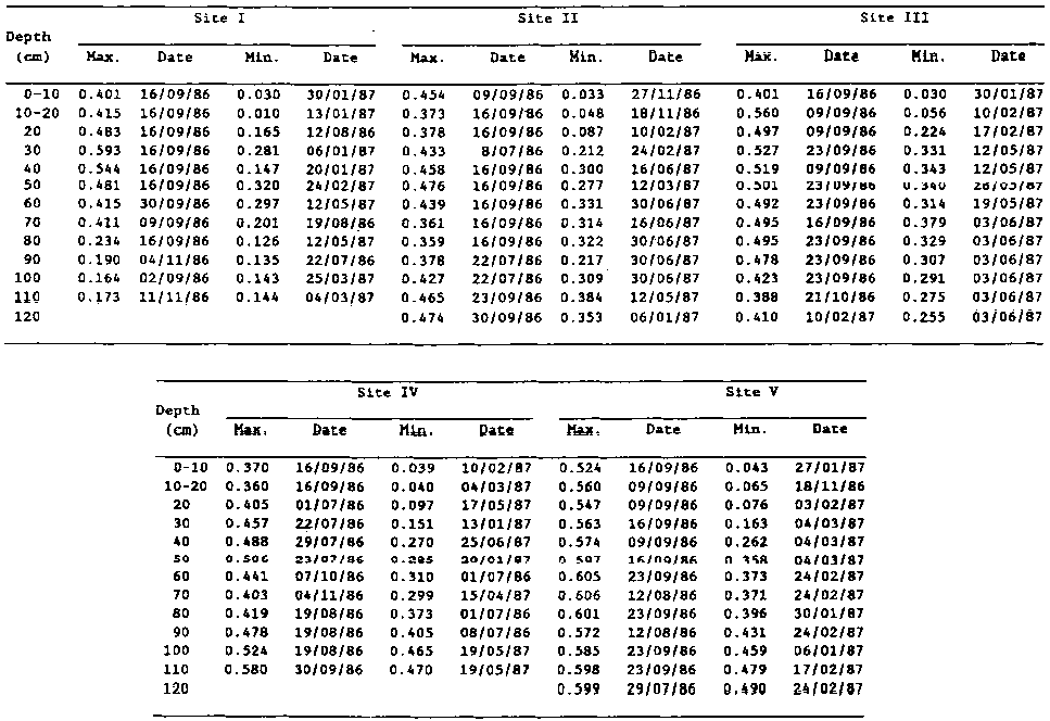 Table 2 shows soil moisture variation with depth at each of the five sites at maximum layer recharge (maximum) and at the driest layer condition (minimum). The maximum moisture recharge from the rains is an indication of the apparent maximum storage capacity of the soils at any depth and site. The magnitude of such a maximum store is affected by the soil texture and structure, which regulate the water transmission characteristics, the position of the site in the landscape, and the amount of rainfall. The top of the toposequence (site I) had a sandy loam texture at about 80 cm, while sites II to V had clay to loam-clay textures (Table 3) throughout the top 1 m, but the differences in the transmission of soil moisture down the profile cannot be attributed entirely to texture.