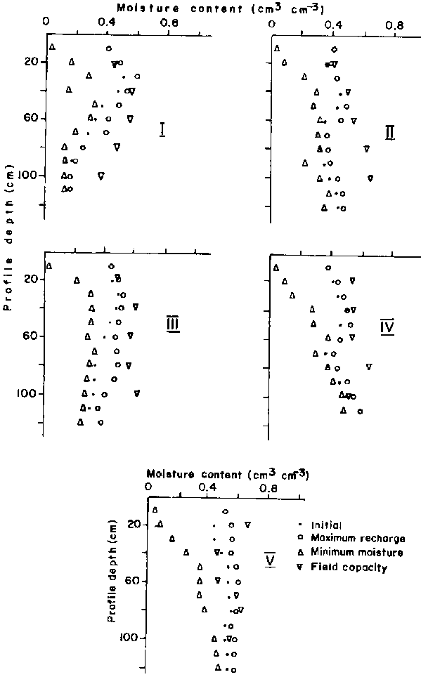 Soil moisture at the 20-cm depth in site I was always higher than at the 50- and 100-cm depths. In site IV, the 50- and 100-cm depths were always wetter than the 20-cm depth. At site V, soil moisture will move primarily down the profile, while in site I movement will be largely lateral in the form of runoff, which will leave little water to percolate into the profile. The patterns at sites II, III and IV were intermediate.
