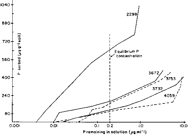 The data from the P sorption experiment are plotted in Figure 3 for low, medium, and high P sorbing soils. In all eases, the sorption and equilibrium P concentration in solution continued to increase with higher rates of P additions There are three categories of P sorption isotherms based upon the quantity of P sorbed (Table 4): low P fixing soils, such as soil 4059; medium to high P fixing soils, such as soils 3753 and 3672; and very high P fixing soils, such as soil 2299.