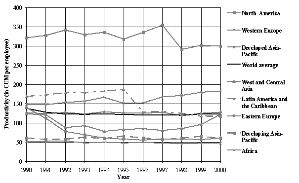 At the level of individual countries, the clear leaders are Finland and Sweden, where labour productivity has grown from 300 CUM to 500 CUM per person over the period. In Canada and the United States of America, there has been a slight downward trend in labour productivity during the 1990s, but these countries still have very high levels of productivity compared with the rest of the World. Chile and New Zealand are two other countries where labour productivity has increased significantly over the period, from 200 CUM to 300 CUM per person.