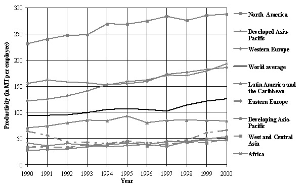 The latter trend is probably partly due to the former trend. Declining prices and value-added per MT has encouraged companies to expand the scale of production (e.g. by building large new mills in Asia and Latin America or expanding existing capacity in North America and Western Europe), to gain economies of scale, cut production costs and increase productivity per employee (in MT). Thus, the industry has generally been able to remain competitive in an environment of falling prices.