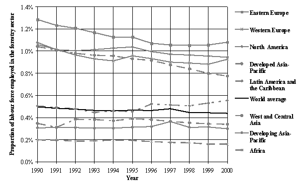 At the global level, the forestry sector currently employs about 0.4 percent of the total labour force and this figure has not changed much during the period 1990 to 2000. There is a very slight downward trend in this figure but, in general, the forestry sector has been able to create new jobs at a rate that has almost kept up with the growth in global population.