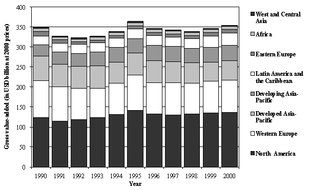 17 Note that the sharp fall in value-added in Western Europe between 1990 and 1991 is probably due to the very high level of roundwood production in 1990, due to storm damage. Excluding this, value-added has remained roughly the same in Western Europe over the last decade. Furthermore, excluding the effect of this, the global trends would indicate a larger increase than the eight percent quoted above.