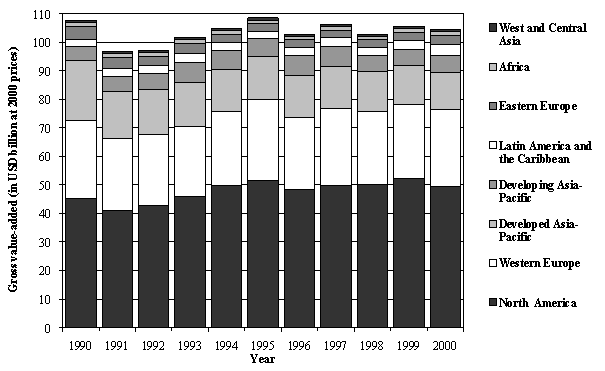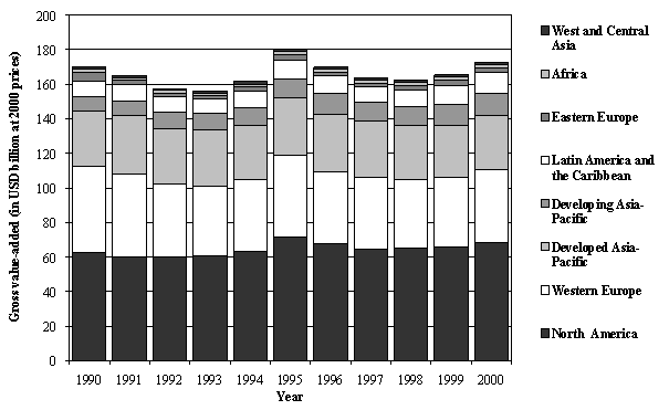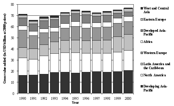 Recent trends in the regional distribution of value-added in the forestry sector are shown in Figure 10. In 2000, the developed regions (North America, Western Europe and the Developed Asia-Pacific region) accounted for 75 percent of the gross value-added in the global forestry sector. However, their share has decreased slightly from about 80 percent in the early-1990s.