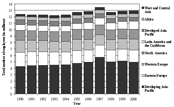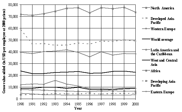 A second important reason for the global decline in productivity is the reduction in production in former-USSR countries (especially the Russian Federation) reported in the early-1990s. This was a very real fall in labour productivity. Production fell by as much as 50 percent in many of these countries, but employment numbers often did not fall by as much (leading to a reduction in labour productivity). Similar problems were experienced across much of the rest of Eastern Europe. However, since the mid-1990s, productivity in Eastern Europe has started to grow consistently and, in 2000, reached a level that was equal to 80 percent of the level in 1990. In all other regions, except North America, labour productivity has grown considerably over the period, by between 20 percent and 50 percent.