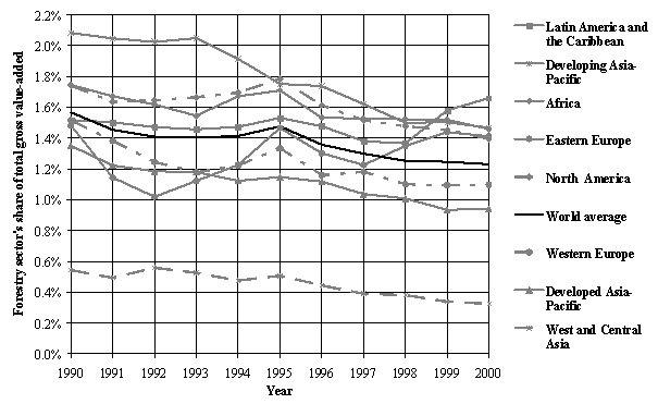 In Latin America and the Caribbean, the forestry sector’s contribution to GDP increased significantly in the late-1990s and, over the whole decade, it has increased from about 1.5 percent in 1990 to almost 1.7 percent in 2000.