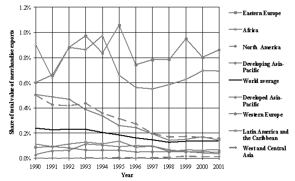As already noted, the value of international trade in forest products increased by almost 50 percent during the last decade. However, in spite of this rapid growth in international trade, the growth in forest products trade has been less than the growth of other merchandise trade. Therefore, the share of forest products in total merchandise exports declined from 2.9 percent in 1990 to 2.2 percent in 2000 (see Figure 21).