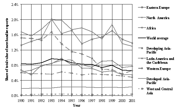 Figure 25 shows the trends in the share of forest products in total merchandise imports by region during the 1990s. Globally, the share fell from about 3.2 percent in 1990 to 2.3 percent in 2000. At the regional level, imports of forest products into the Developed Asia-Pacific region are relatively more important than elsewhere, although this importance has fallen dramatically over the last decade from five percent to three percent (due to a sharp fall in the value of imports into Japan). In most other regions, the share of forest products imports in total merchandise imports is close to the global average or slightly below it. In most of these regions, this share has also declined or remained about the same since 1990.