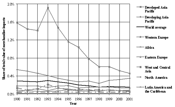 Figure 27 shows the recent trends in the share of wood industry products in total merchandise imports during the 1990s, which has declined from about 0.9 percent in 1990 to 0.7 percent in 2000. At the regional level, the importance of wood industry products is far higher in the Developed Asia-Pacific region than elsewhere. This is due to the high level of imports into Japan, which has remained stable during the last decade. There is a clear downward trend in the importance of imports of wood industry products in every region except Eastern Europe.
