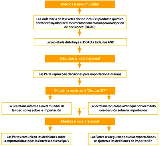 Para cada uno de los productos químicos incluidos en el Anexo III del Convenio se prepara un DOAD que se envía a todas las Partes, pidiéndoles que tomen una decisión sobre si permitirán o no importaciones futuras de ese producto. Las decisiones resultantes con respecto a la importación son publicadas por la Secretaría y puestas a disposición de todas las demás Partes a través de una Circular CFP (véanse la sección 1.4.3 y el anexo 7.2 de la presente guía).