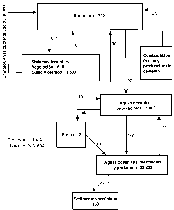 Desde hace mucho tiempo se reconoce la importancia de los bosques como productores de bienes y servicios, tales como productos forestales, combustible, conservación de los recursos de suelos y aguas, recreación y biodiversidad. Actualmente, se reconoce también que las masas forestales juegan un papel importante en los ciclos biogeoquímicos del mundo y, en particular, en el ciclo global del carbono (Dixon et al., 1994). Dicho ciclo desempeña una función de relieve al regular la concentración atmosférica del dióxido de carbono, importante gas de efecto invernadero. La concentración creciente de CO2 en la atmósfera contribuye al calentamiento de la Tierra y, por consiguiente, al cambio climático. Las principales reservas de carbono son la atmósfera, los combustibles fósiles, los océanos, las biotas terrestres y los suelos (Figura 1, pág. 6). Estas reservas intercambien carbono con los suelos en forma de dióxido de carbono (CO2), por la quema de combustibles fósiles; la producción primaria neta y la respiración de las biotas, los suelos, y otras formas de materia orgánica muerta; la deforestación y la forestación (repoblación forestal y plantación de árboles) y el rebrote de la vegetación que ha sufrido trastornos; y, por último, la diseminación a través de los océanos.