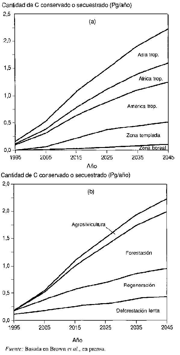 Las tasas anuales de conservación y secuestro del carbono obtenidas mediante todas estas prácticas aumentarían con el tiempo, alcanzando para el año 2050 el valor aproximado de 2,2 Pg/año (Figura 2); la mayor acumulación de carbono tendría lugar en la zona tropical, y la más reducida en la zona boreal. En un principio el mayor ahorro de carbono se debería a la reducción de la deforestación y la regeneración de los bosques, pero a partir del año 2025, momento en que las plantaciones alcanzarían su máxima acumulación de carbono, éstas secuestrarían cantidades prácticamente idénticas a las retenidas gracias a la reducción de la deforestación y a la regeneración de los bosques (Figura 2).