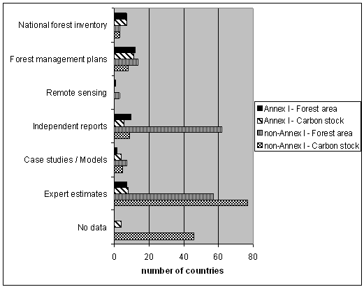 The results show that forests are not systematically monitored in the majority of countries and especially not in non-Annex I countries on which current discussions on deforestation and forest degradation in the UNFCCC context focus. This means that accuracy and precision of reported information is not possible to determine for most countries. The quality problem of relying on independent assessments or expert estimates is well illustrated by Global Forest Resources Assessment 2000 findings, where the forest area change reported by African countries was overestimated by more than a factor two, compared with a systematic remote sensing survey (FAO 2001).