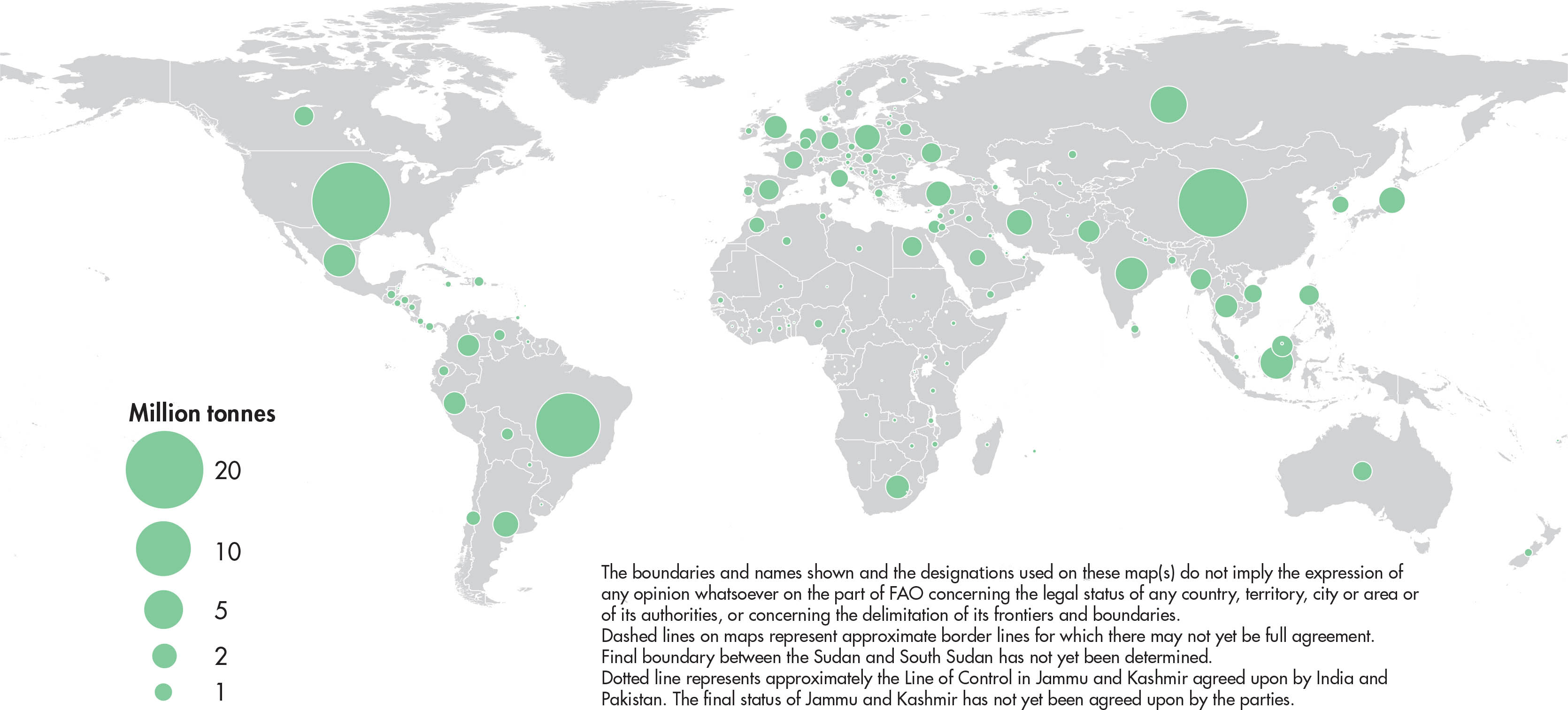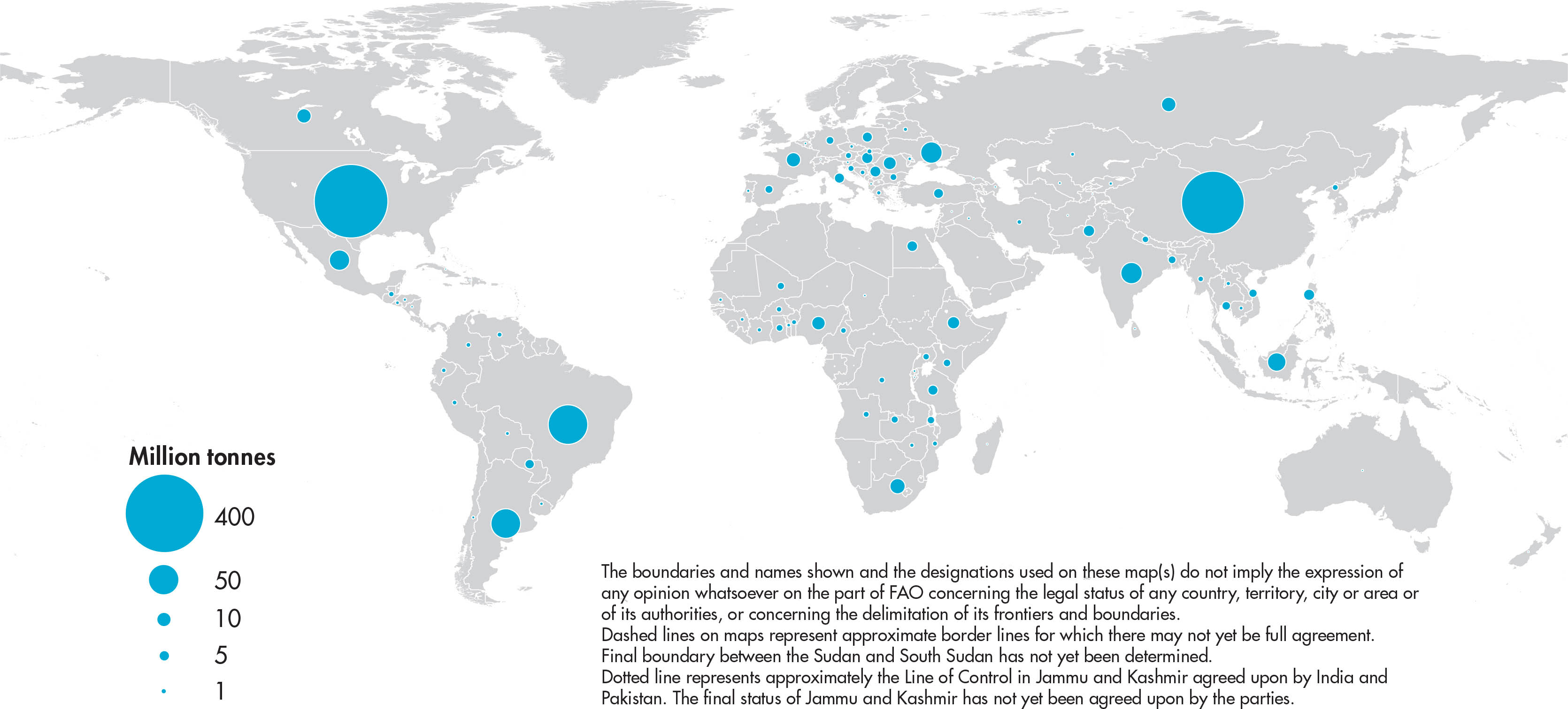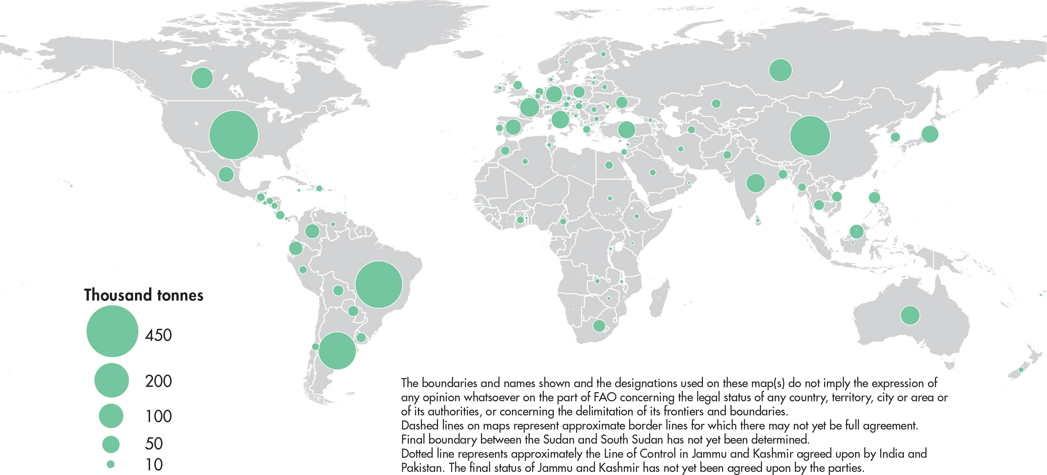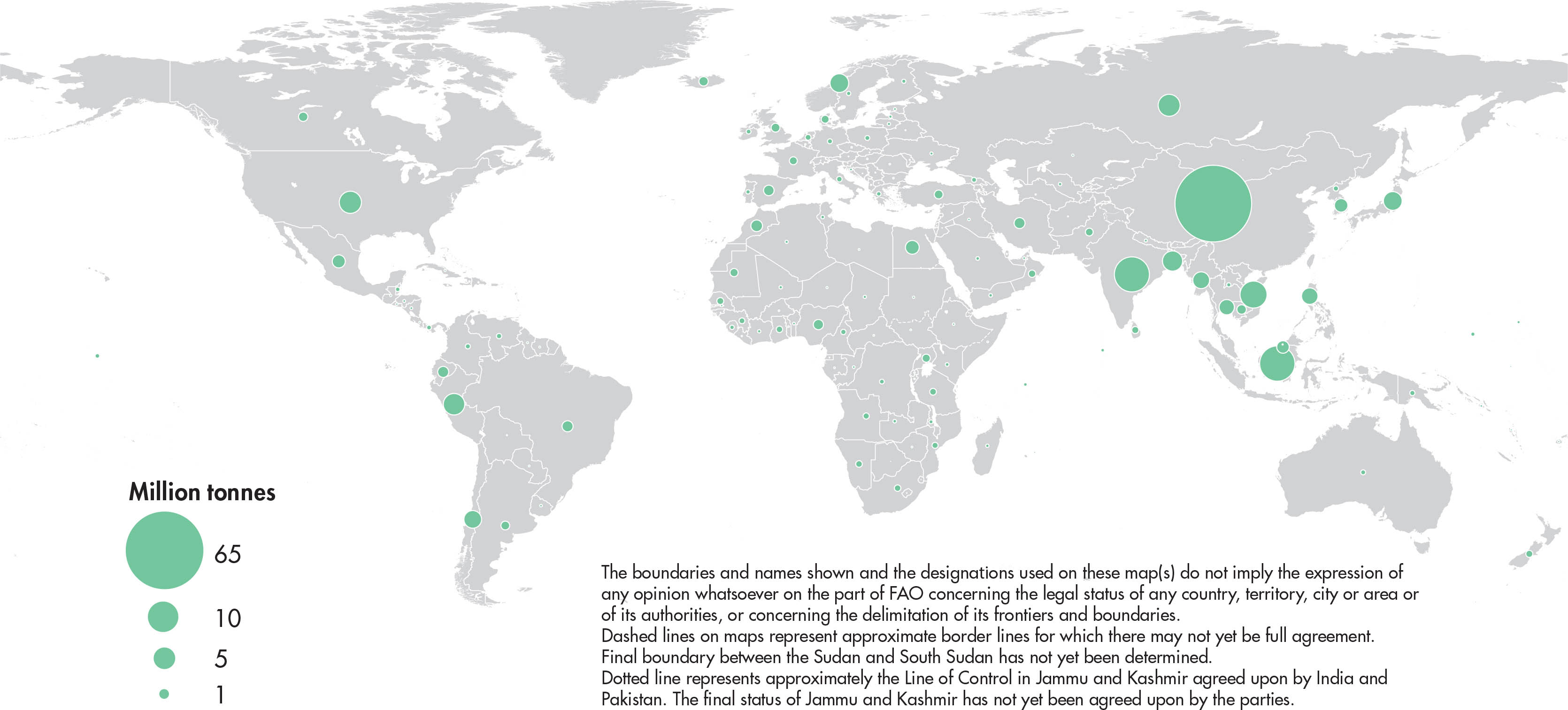 Figures relate to the total domestic production whether inside or outside the agricultural sector, i.e. they include non-commercial production and production from kitchen gardens. Unless otherwise indicated, production is reported at the farm level for crop and livestock products (i.e. in the case of crops, excluding harvesting losses) and in terms of live weight for fish items (i.e. the actual ex-water weight at time of catch). All data shown relate to total meat production from both commercial and farm slaughter. Data are expressed in terms of dressed carcass weight, excluding offal and slaughter fats. Production of beef and buffalo meat includes veal; mutton and goat meat includes meat from lambs and kids; and pig meat includes bacon and ham in fresh equivalent. Poultry meat includes meat from all domestic birds and refers, wherever possible, to ready-to-cook weigh.