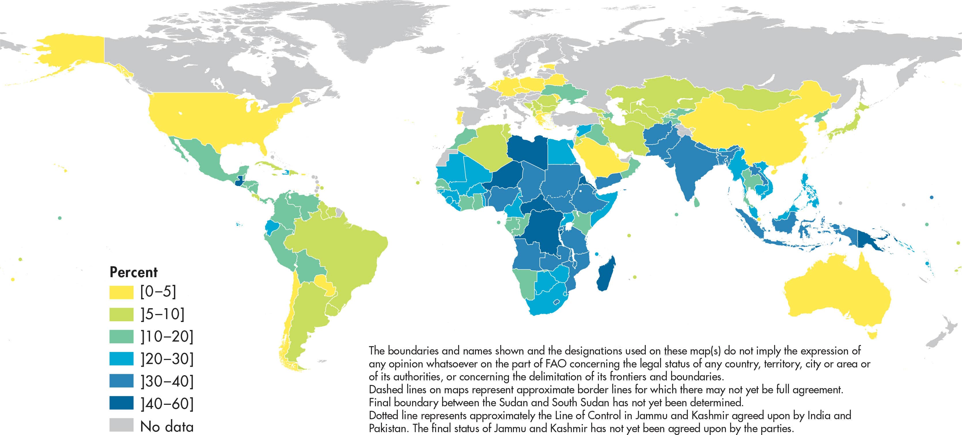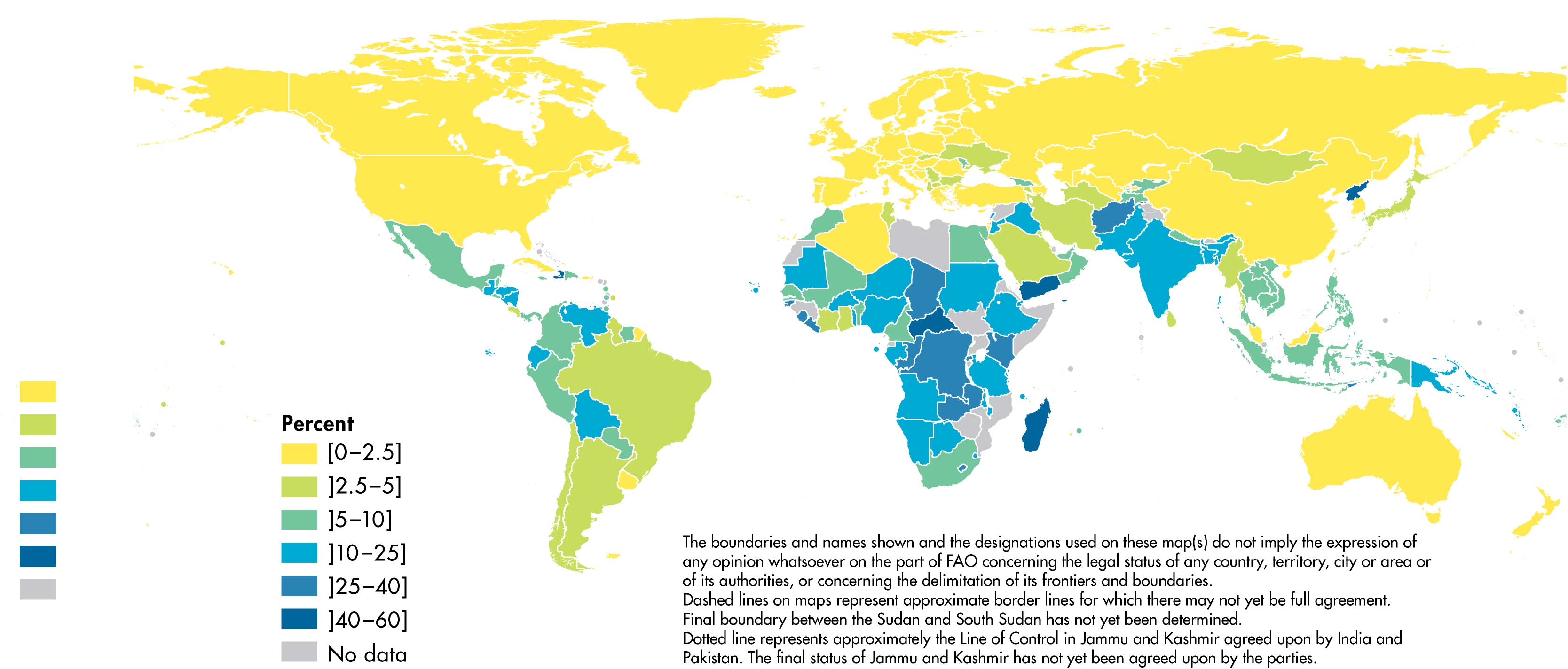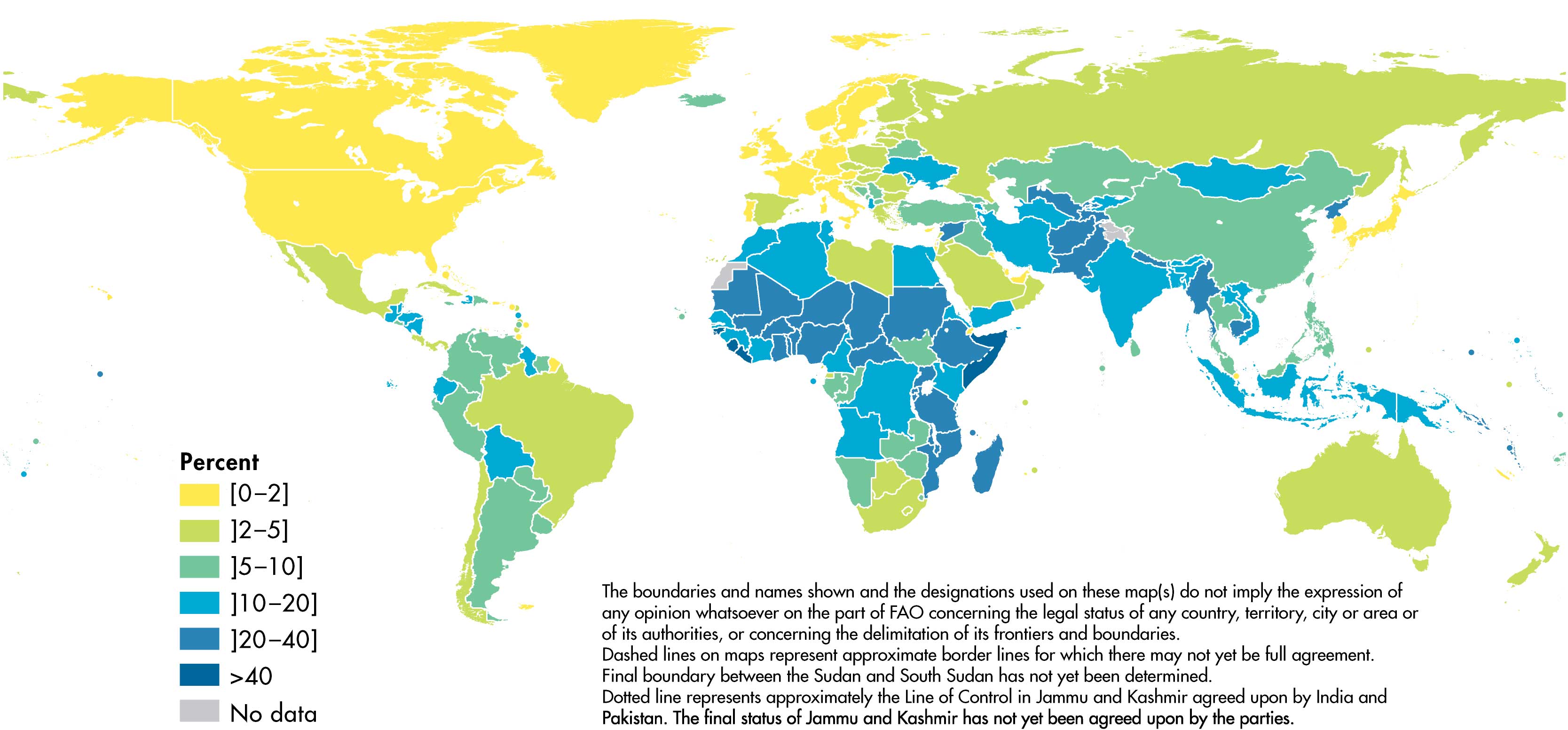 The number of people undernourished is obtained by multiplying estimates of the proportion of undernourished for each country by estimates of the total population. Undernourishment refers to the condition of people whose dietary energy consumption is continuously below a minimum dietary energy requirement for maintaining a healthy life and carrying out light physical activity.