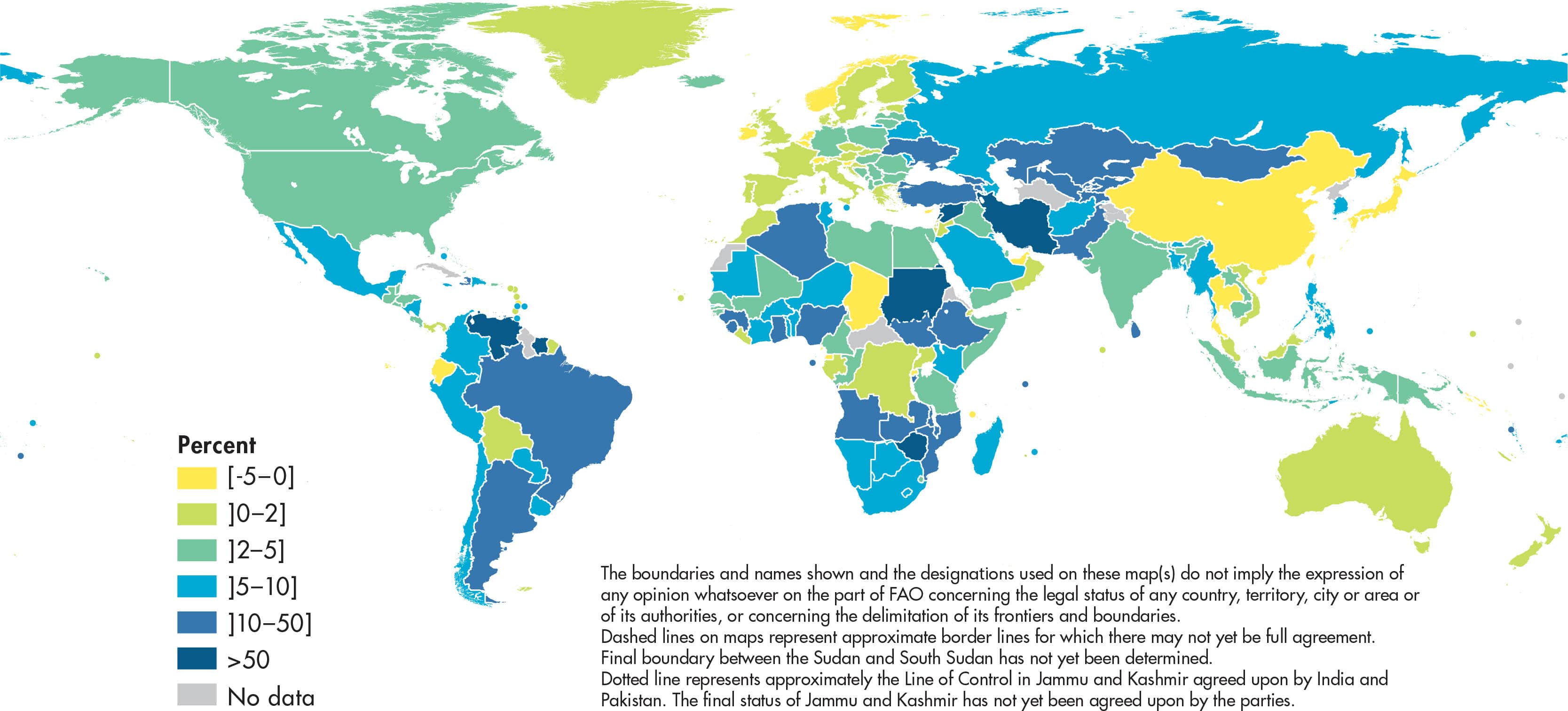 The inflation rate of an index for any month refers to the percentage change in the index value for the month as compared to the index value of the corresponding month of the previous year. Global and regional food consumer price inflation measures food inflation for a group of countries at different geographical scales: Africa, Europe, Oceania, Latin America and the Caribbean, North America and Asia. Global and regional inflation are calculated using household consumption expenditure weights.