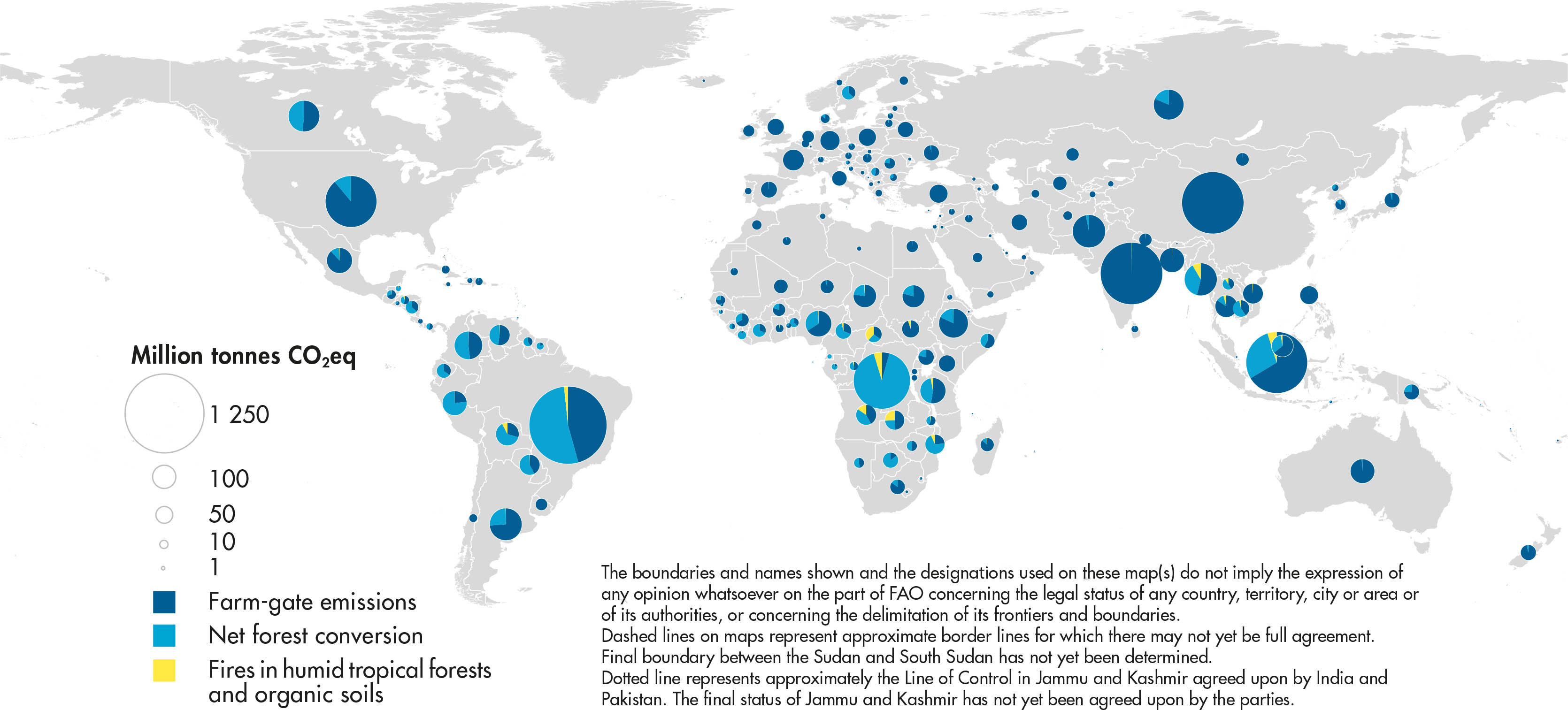 Farm-gate emissions covers all GHG emissions produced from agricultural processes (enteric fermentation, manure management, rice cultivation, synthetic fertilizers, manure applied to soils, manure left on pastures, crop residues, drained organic soils, burning of crop residues, savanna fires, energy use) within the farm gate and at the farm boundary. Non-CO2 gases, namely methane (CH4) and nitrous oxide (N2O), are produced by crop and livestock production and management activities whereas CO2 emissions are produced from the drainage of organic soils and energy used on farms. The FAOSTAT emissions database is computed following Tier 1 Intergovernmental Panel on Climate Change (IPCC) 2006 Guidelines for National GHG Inventories.