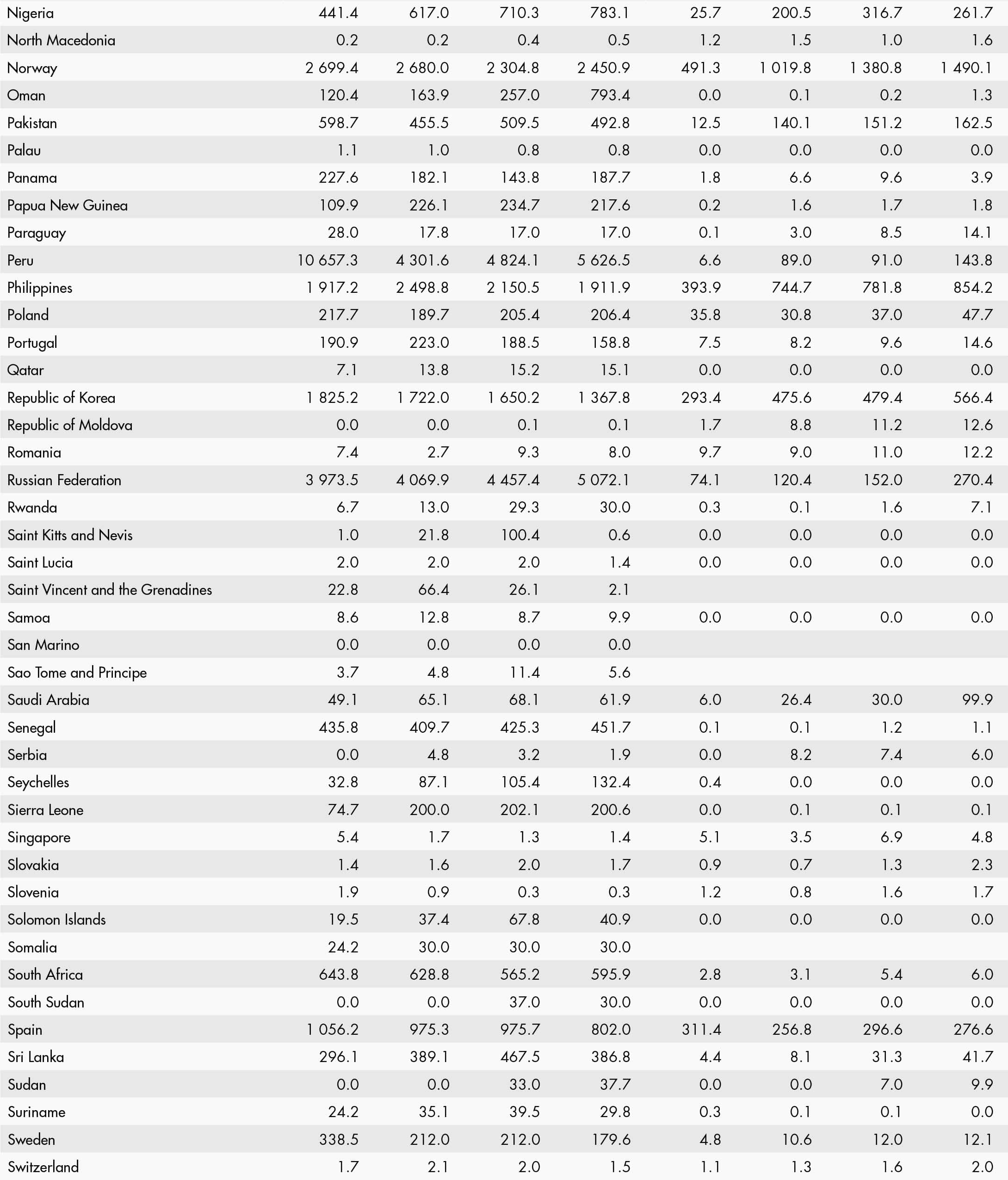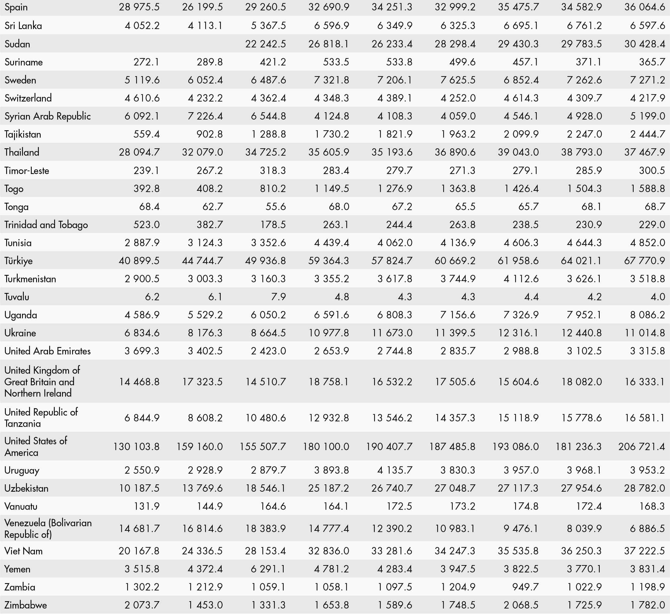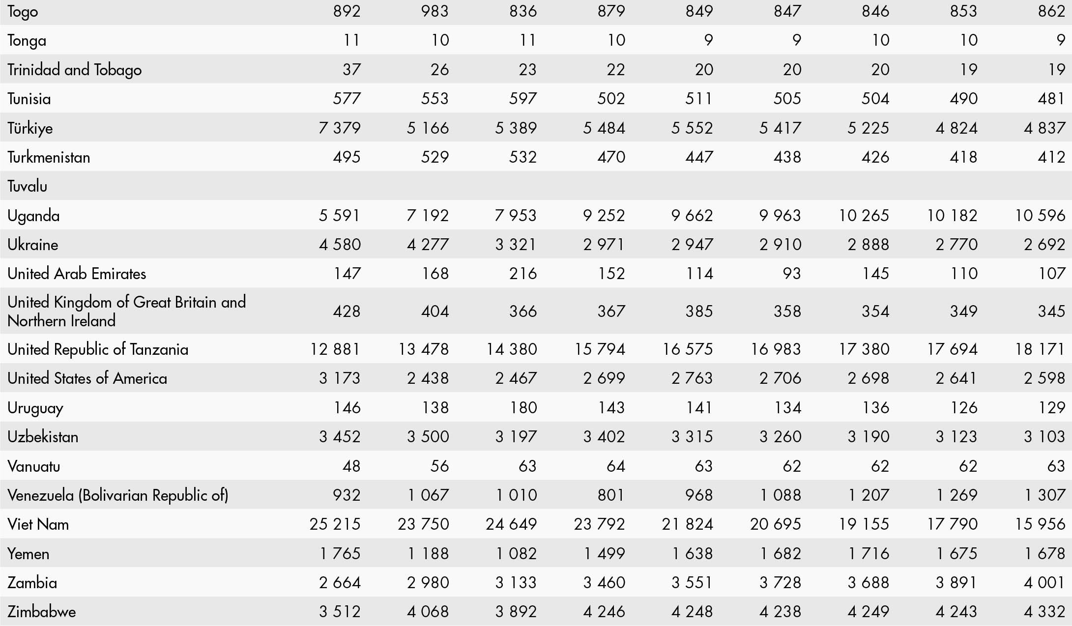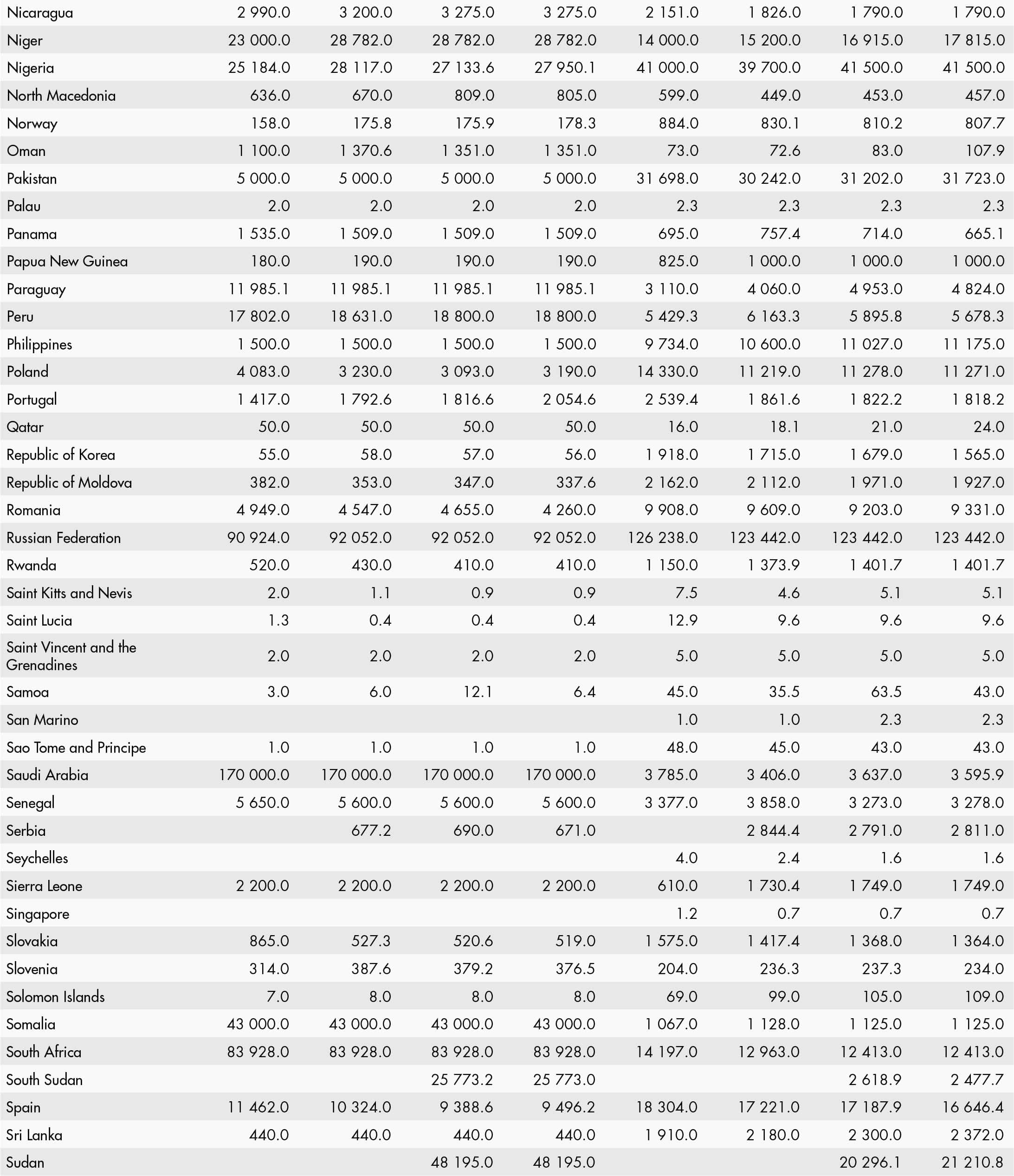 This statistical yearbook was prepared by the Statistics Division (ESS) of the Food and Agriculture Organization of the United Nations (FAO) in collaboration with the Communications (OCC), Fisheries and Aquaculture (NFI), Forestry (NFO), Land and Water (NSL) and Markets and Trade (EST) divisions. Olivier Lavagne d’Ortigue led the work under the direction of José Rosero Moncayo (ESS Director). We would like to thank the following for their contributions and input: Iana Arkhipova, Veronica Boero, Carlo Cafiero, Giulia Conchedda, Piero Conforti, Christophe Duhamel, Adrienne Egger, Laura Galeotti, Chiara Gnetti, Amanda Gordon, Leman Yonca Gürbüzer, Dominique Habimana, Anne Kepple, Irina Kovrova, Eun Jeong Lee, Xinman Liu, Livia Lombardi, Jeannie Marshall, Patricia Mejias Moreno, Elisa Miccinilli, Jean-Marie Munyeshyaka, Griffiths Obli Laryea, Ashley Steel, Kimberly Sullivan, Salar Tayyib, Francesco Tubiello, Monica Umena, Stefania Vannuccini, Sara Viviani, Michele Vollaro, Sven Walter, Nathan Wanner and Firas Yassin.