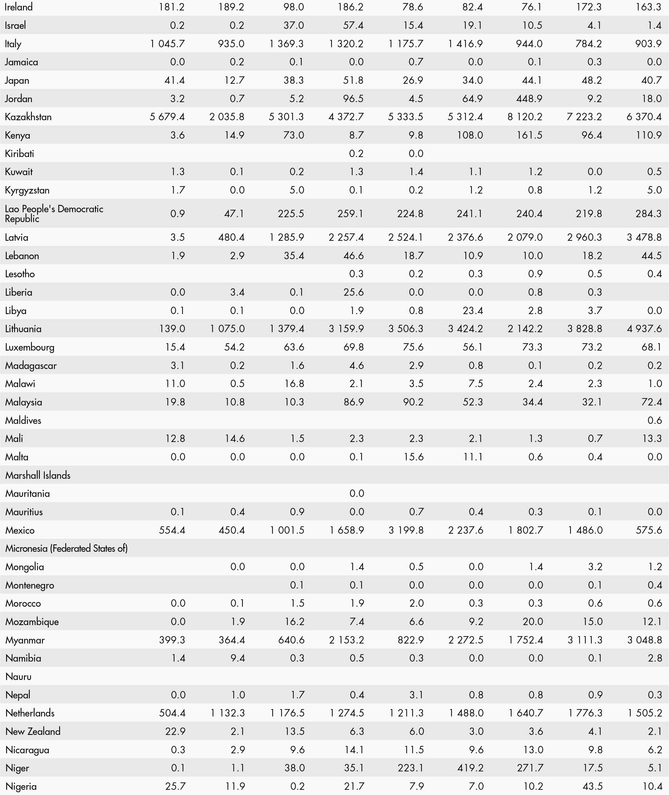 Products imported for domestic consumption or processing shipped into a country are forest product imports. They include imports into free economic zones or for re-export and exclude “in-transit” shipments. They are reported in cubic metres of solid volume or metric tonnes and values normally include cost, insurance and freight (CIF).