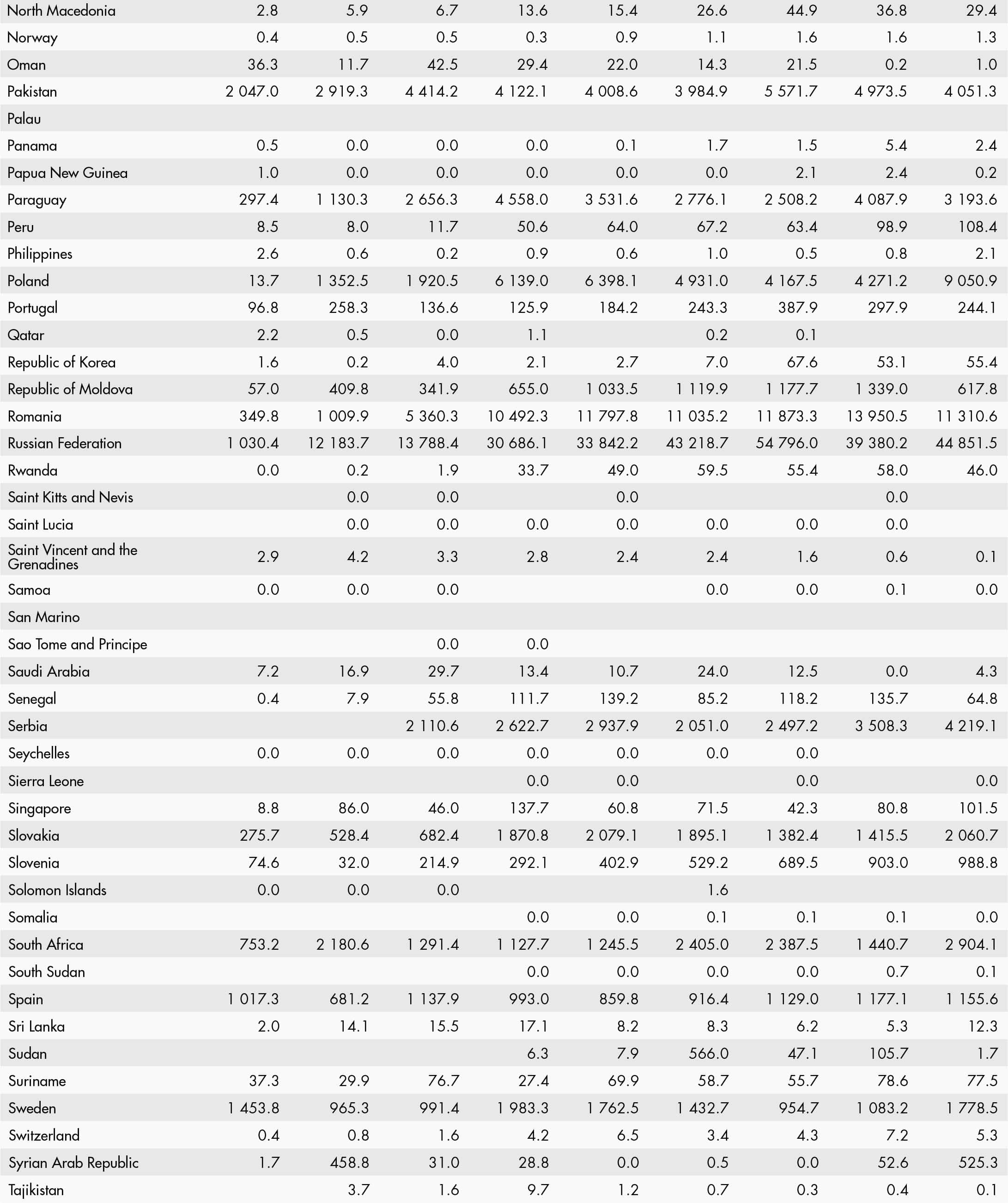 Products of domestic origin or manufacture shipped out of the country are forest product exports. They include exports from free economic zones and re-exports and exclude “in-transit” shipments. They are reported in cubic metres of solid volume or metric tonnes and values are normally recorded as FOB.