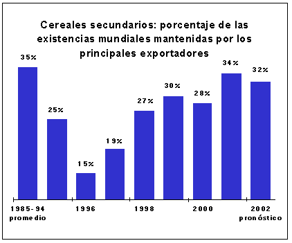 Es probable que las existencias de cereales secundarios de los grandes exportadores desciendan a 72 millones de toneladas, 9 millones de toneladas menos que en la campaña anterior. Situadas en este nivel, es probable que en 2001/02 la relación entre las existencias y su total desaparición disminuya a 16,3 por ciento, en comparación con el 18,4 por ciento en 2000/01. El detonante principal de la disminución sería la probable contracción de las existencias en los Esta-dos Unidos, debida a una merma de la producción de 2001. Por el contrario, es probable que aumenten por tercer año consecutivo las existencias de cereales se-cundarios de la CE, ya que los suministros continúan superando la demanda, especialmente de centeno, que es cada vez menos competitivo que la cebada y el trigo.