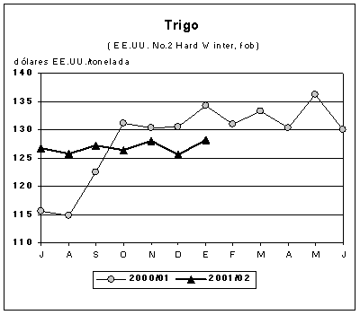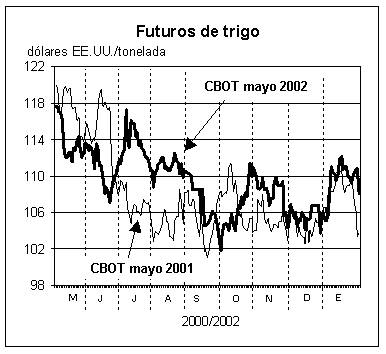 Los precios internacionales del trigo siguen siendo en general más bajos que en la campaña anterior pese a un estancamiento de la producción mundial de trigo y, lo que es más importante, a una brusca disminución de la producción de los principales exportadores de trigo. Hasta ahora el aumento de las importaciones mundiales de trigo no ha logrado prestar el apoyo necesario para un aumento sostenido de los precios, aunque los del trigo para molienda de alta calidad se han afirmado a causa de la escasez de los suministros mundiales y el fortalecimiento de la demanda. En general, el nivel excepcionalmente bajo de las exportaciones de trigo de la CE y las incógnitas que rodean la situación en la Argentina deberían haber servido de estímulo para el fortalecimiento de los precios, pero el exceso de los suministros de Europa oriental y central, así como de la India y el Pakistán, ha estabilizado los precios mundiales. En enero, el precio medio del trigo No. 2 de los Estados Unidos (HRW, fob) fue de 128 dólares EE.UU. por tonelada, sin variaciones desde noviembre de 2001, y 6 dólares EE.UU. menos por tonelada que en el período correspondiente del año pasado. En lo que resta de la campaña los precios podrían ir descendiendo gradualmente, aunque el cuadro general se mantiene incierto y dependerá mucho de las perspectivas para la producción de 2002 en el hemisferio norte. Las fluctuaciones recientes de los futuros de trigo en el Chicago Board of Trade (CBOT) han mostrado una tendencia más inestable pero indecisa. En general, los futuros de trigo se mantienen cercanos a los niveles registrados en el período correspondiente del año pasado, pero a finales de enero los futuros de mayo se cotizaron en el CBOT a 108 dólares EE.UU. por tonelada, poco menos que al principio del mes.
