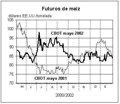 La evolución de los precios internacionales del maíz también mostraron una tendencia semejante a la del trigo, dada la situación muy semejante de la oferta y la demanda de ambos productos. El aumento de la pro-ducción mundial de maíz y la cuantía extraordinaria de los suministros exportables de algunos de los exporta-dores no tradicionales, como el Brasil, siguen pesando en el mercado. En enero, las cotizaciones del precio de exportación del maíz amarillo No. 2 de los Estados Unidos alcanzó un promedio de 92 dólares EE.UU. por tonelada, 2 dólares EE.UU. más que en noviembre de 2001 pero inferior todavía al del período correspon-diente del año pasado. Si se tiene en cuenta el debili-tamiento de la demanda mundial, resultan también li-mitadas las perspectivas para cualquier incremento moderado de los precios en los próximos meses. En las últimas semanas, los valores del CBOT han des-cendido por debajo de los niveles de la campaña ante-rior, y al final de enero los futuros de mayo se cotiza-ron a 84 dólares EE.UU. por tonelada, más bajos todavía que el año pasado.