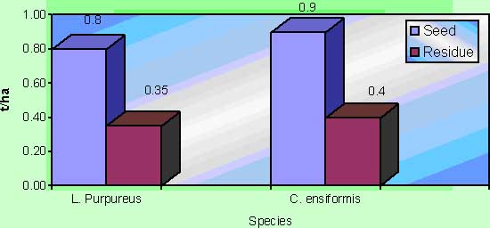 Samples of two grass species (Dichanthiun aristatum and Brachiaria mutica), of the five herbaceous legumes (Centrosema pubescens, Desmodium uncinatum, Teramnus uncinatus, Rhynchosia minima and Vigna sp.) and of the three shrub species (Crescentia cujete, Gliricidia sepium and Leucaena leucocephala) were collected manually by following the cows and sampling a similar fraction of the plant as grazed or browsed by the cows. Forage samples and faeces samples were dried at 60º C to a constant weight. Dried faecal and herbage samples were ground through hammer mills fitted with a 1 mm mesh sieve. Samples of herbage and faeces were taken to the Macaulay Land Use Research Institute (MLURI) in Aberdeen (UK) to determine n-alkane concentration. The alkanes were extracted from 0.1g dried faeces and 0.2g dried herbage using the modification described by Salt et al. (1992), of the method of Mayes et al. (1986a). The equipment used was a Unicam PU 4500 Gas Chromatograph (GC) fitted with a flame-ionisation detector. The column Supelco, a SPB-1 bonded phase gas column, was 30 m long x 0.75 mm i.d. glass with a film thickness of 1 mm. Data was captured on a Thermo-separations Chromjet Integrator and transferred to a computer via Spectra-Physics Labnet Software. Data was processed using Spectra-Physics Winner software followed by Microsoft Excel. The plant species composition of the diet was estimated from the patterns of alkanes found in the faeces and in the dietary plants using a least-squares optimisation routine (Excel Solver); the algorithm selected dietary plant proportions such that the sum of the squared discrepancies between the actual faecal alkane concentration (corrected for incomplete recovery), and the calculated concentration was minimised. After calculating the C32 and tritriacontane (C33) concentrations of the whole diet of each cow, feed intake was calculated using the equation described by Mayes et al. (1986a).
