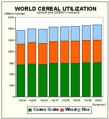 Following a fairly robust 2 percent growth in 1999/00, total cereal utilization could stagnate in 2000/01 at 1,907 million tonnes. Nevertheless, total cereal utilization would still be above the average of the preceding three years. The volume of cereals used for food consumption is currently forecast to rise by 1.1 percent, primarily among the developing countries in Asia and in the CIS. On a per caput basis, however, this would not be sufficient to raise the average kilogram intake of cereals either at the world level or for the developing countries as a group. In spite of the concerns about the contamination of animal feed with BSE infected meat and bone meal and, more recently, the foot-and-mouth (FMD) disease, global feed usage is not likely to be significantly affected in the short-run from these animal diseases.