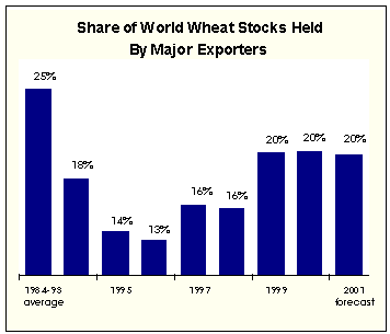 World stocks of wheat for crop years ending in 2001 are currently put at 243 million tonnes, up slightly from the previous report. At this level, world wheat inventories would be 14 million tonnes, or 5 percent,