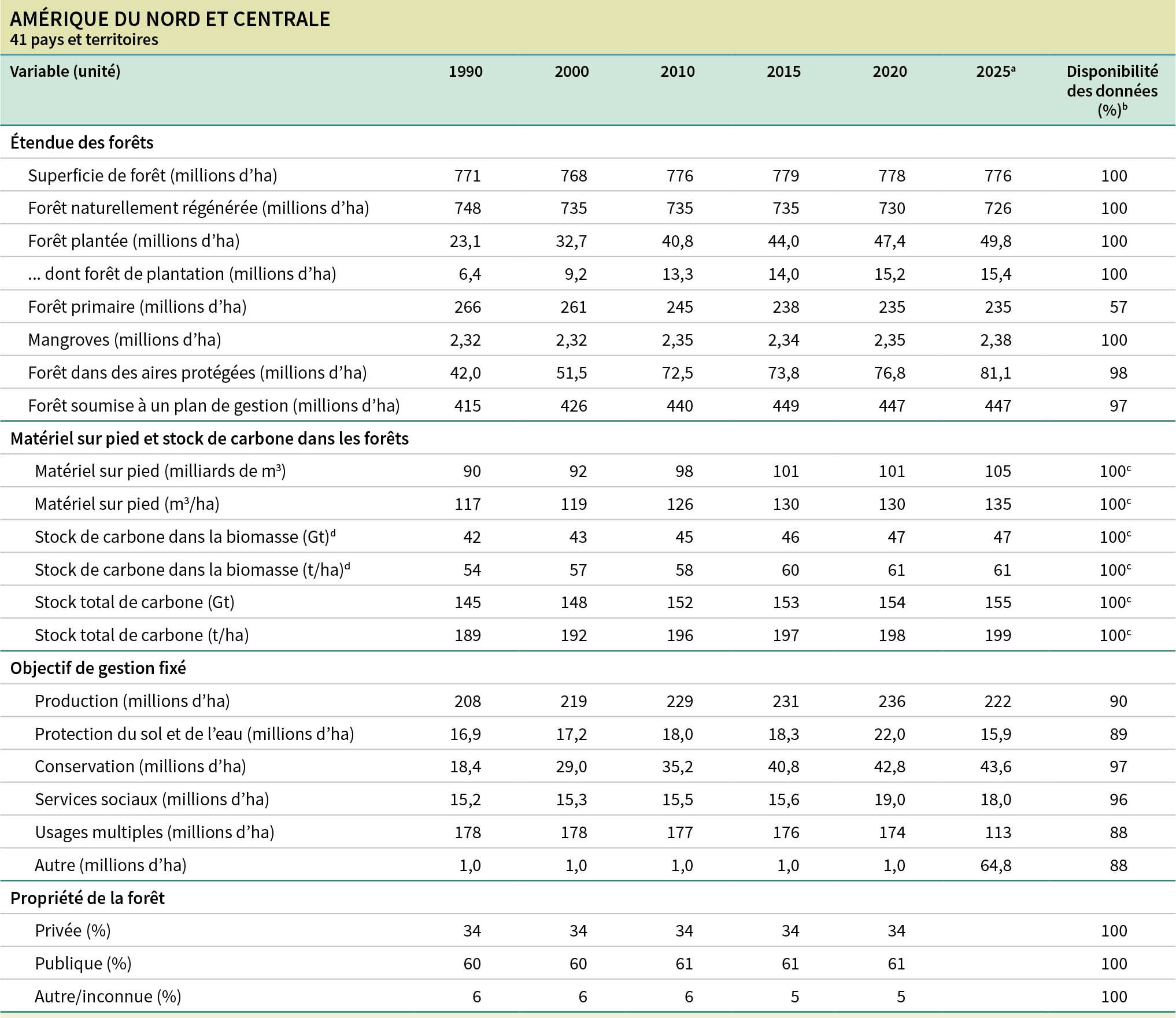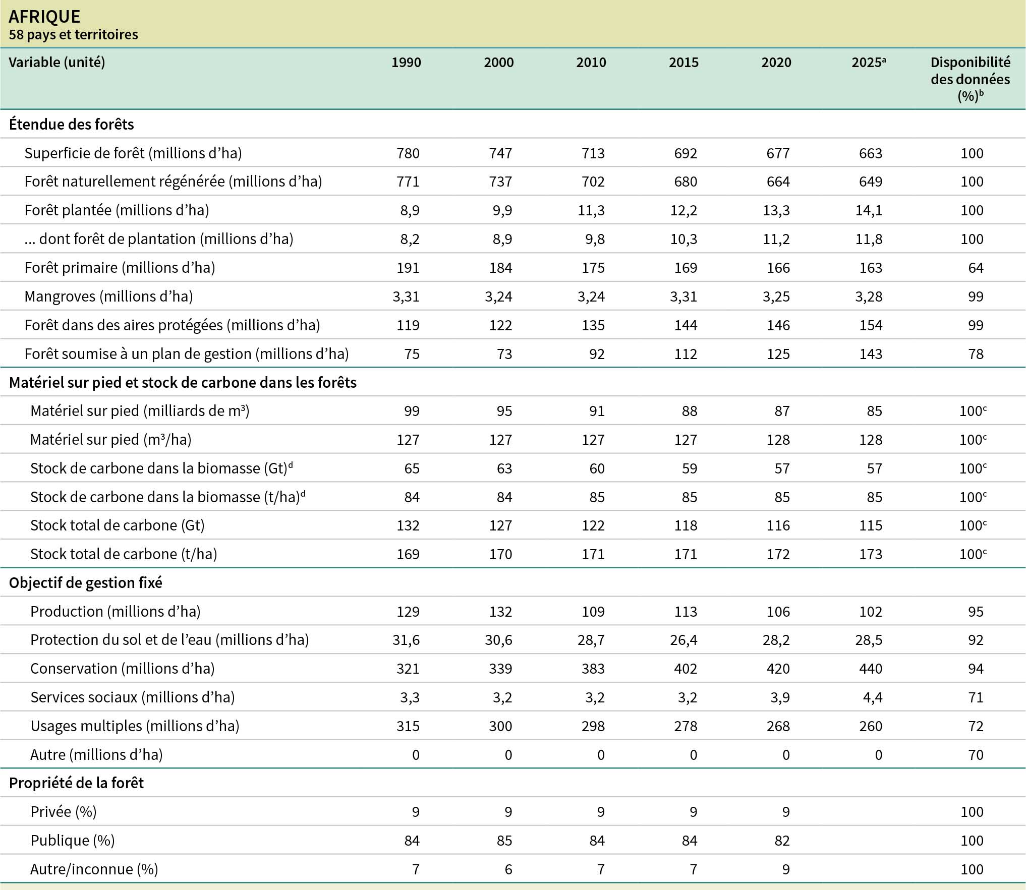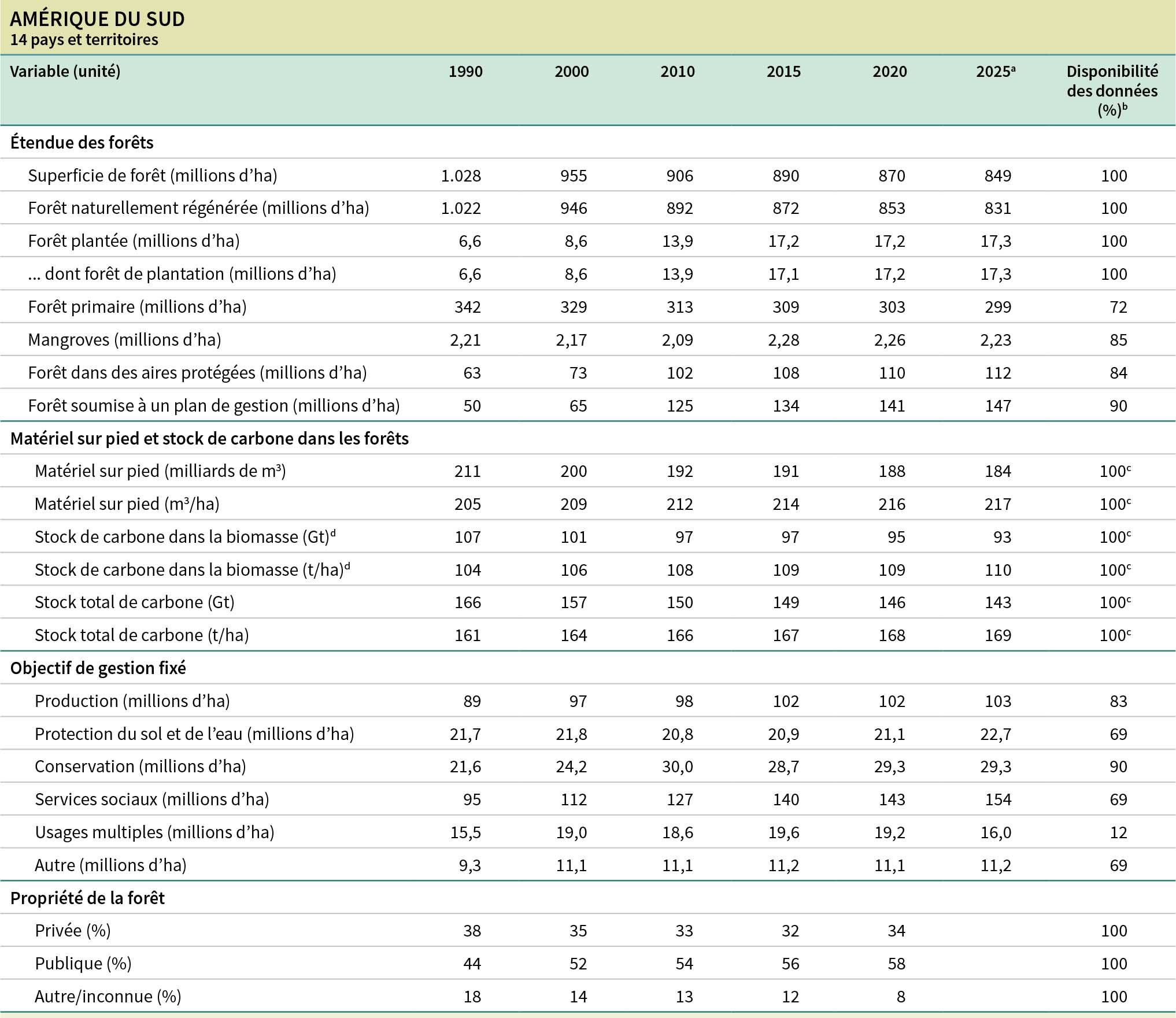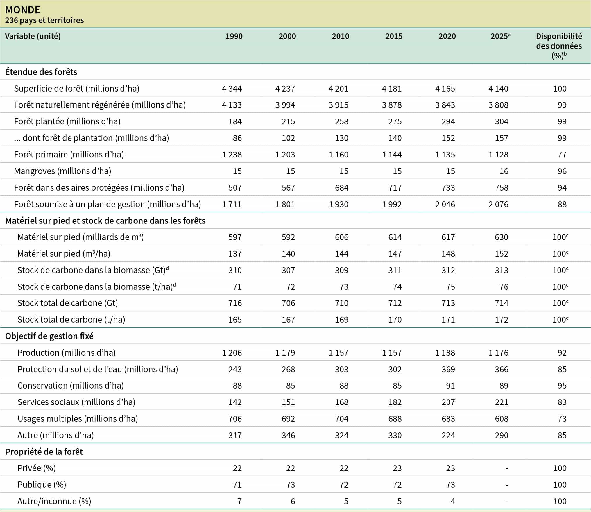 b La disponibilité des données correspond au pourcentage de la superficie totale de forêt représentée par les pays déclarants.