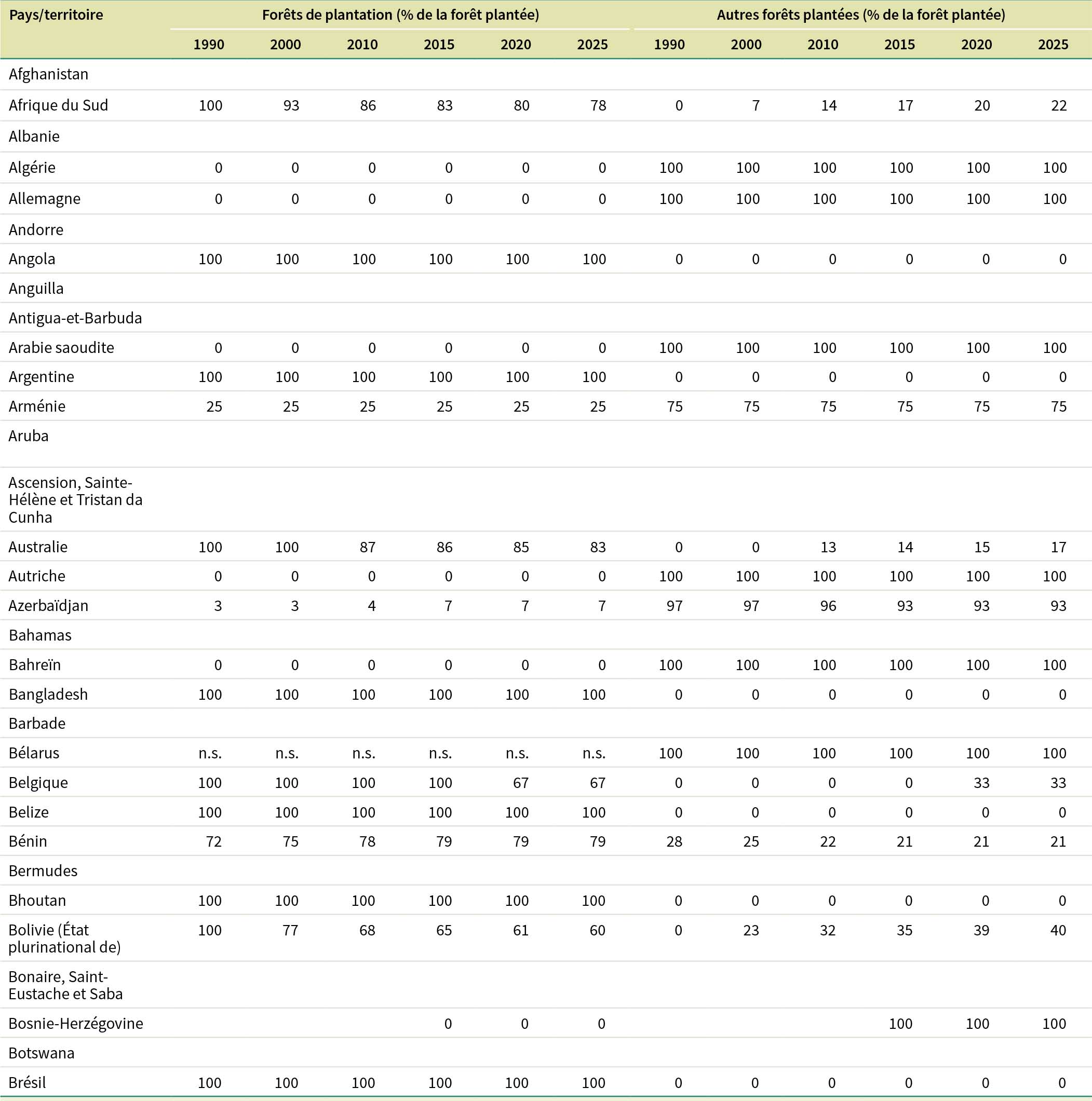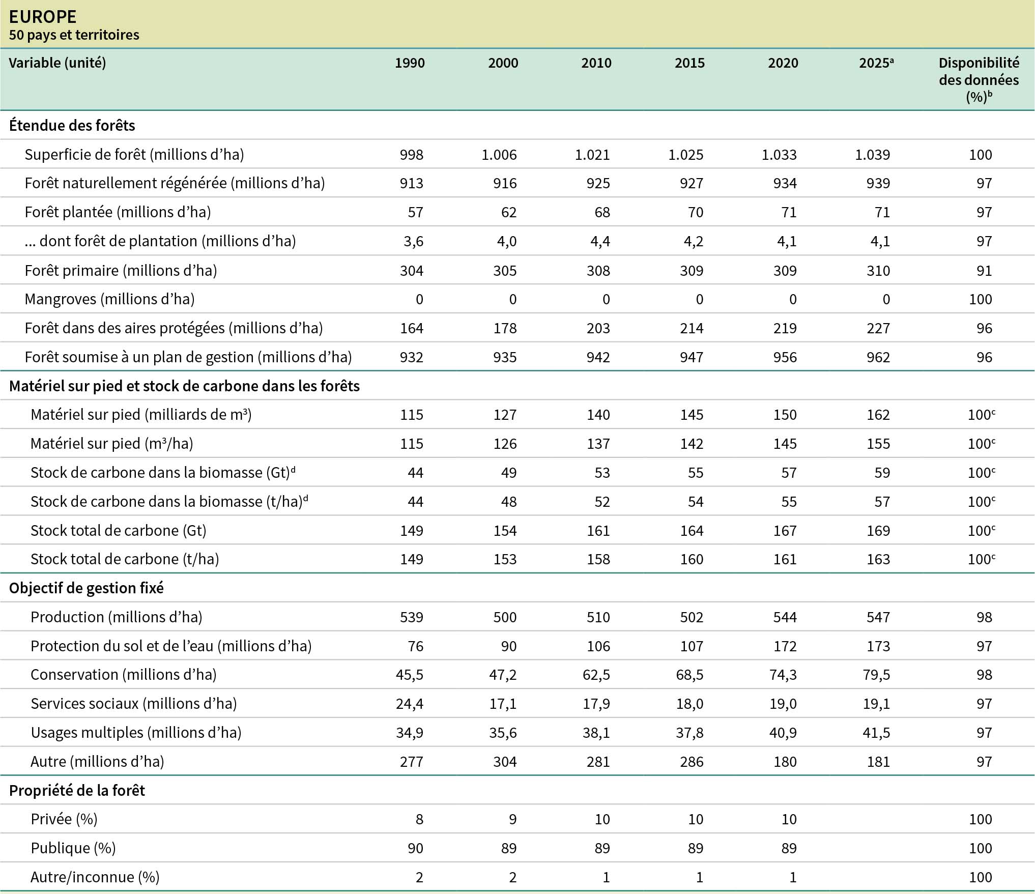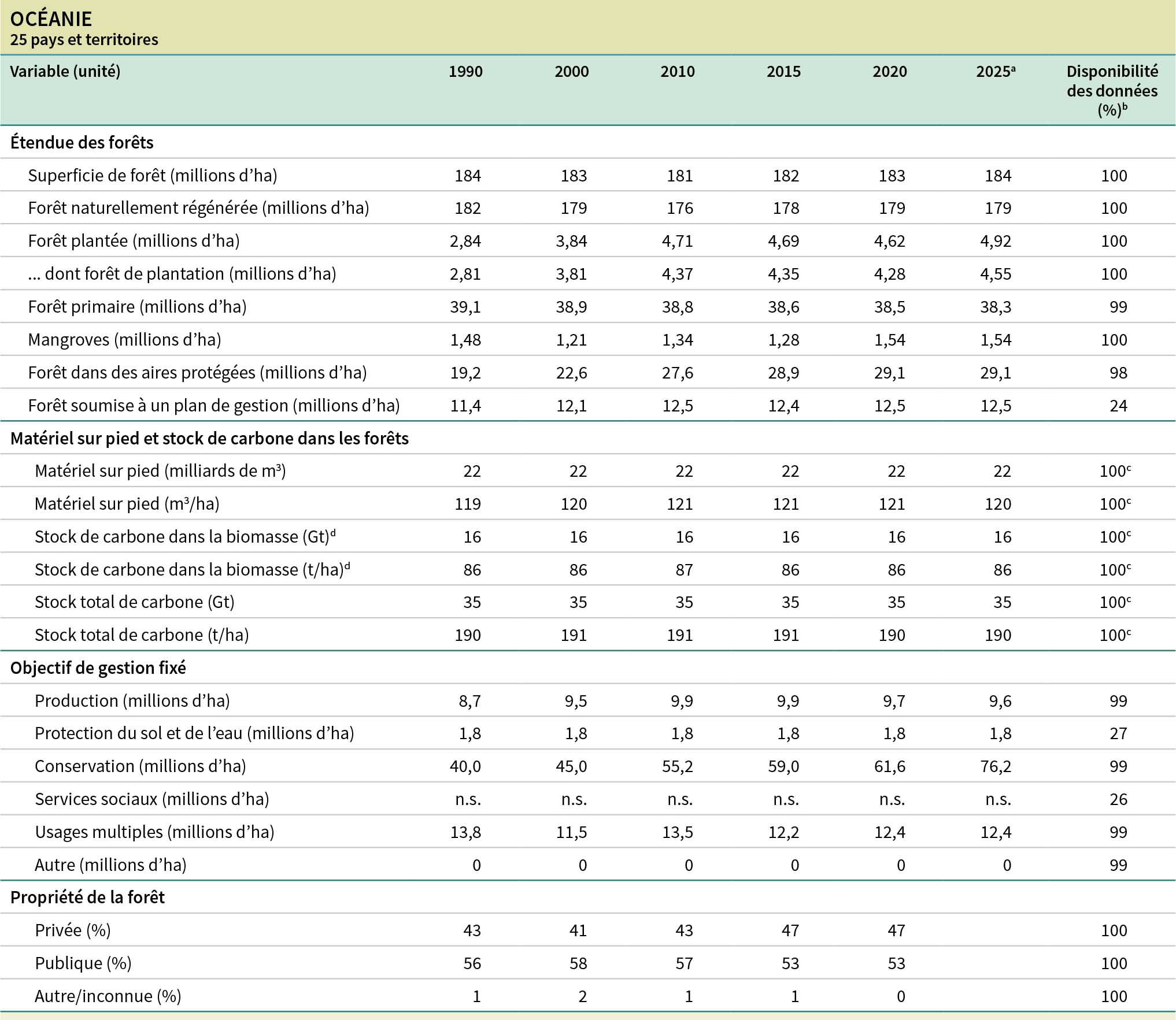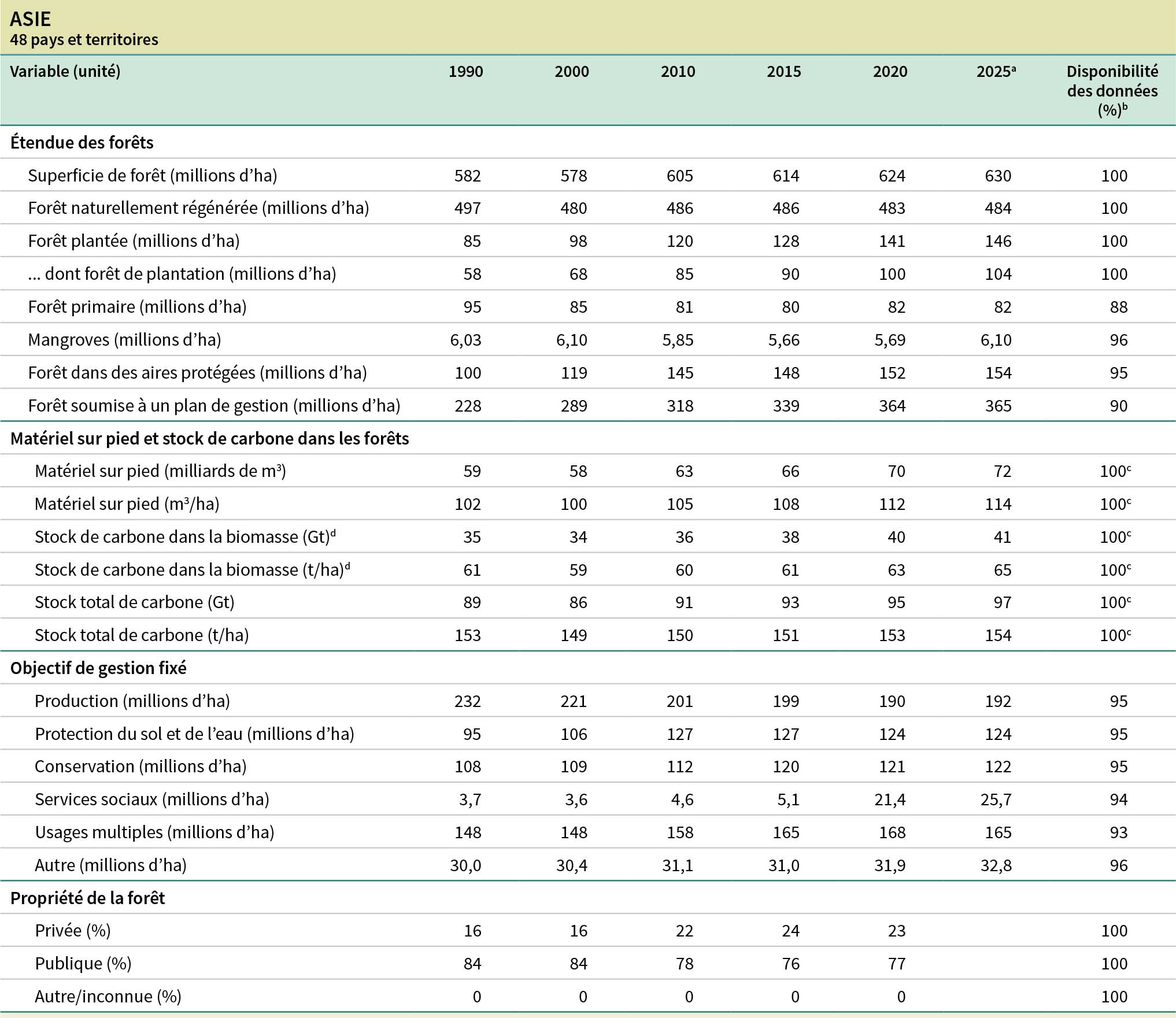 b La disponibilité des données correspond au pourcentage de la superficie totale de forêt représentée par les pays déclarants.