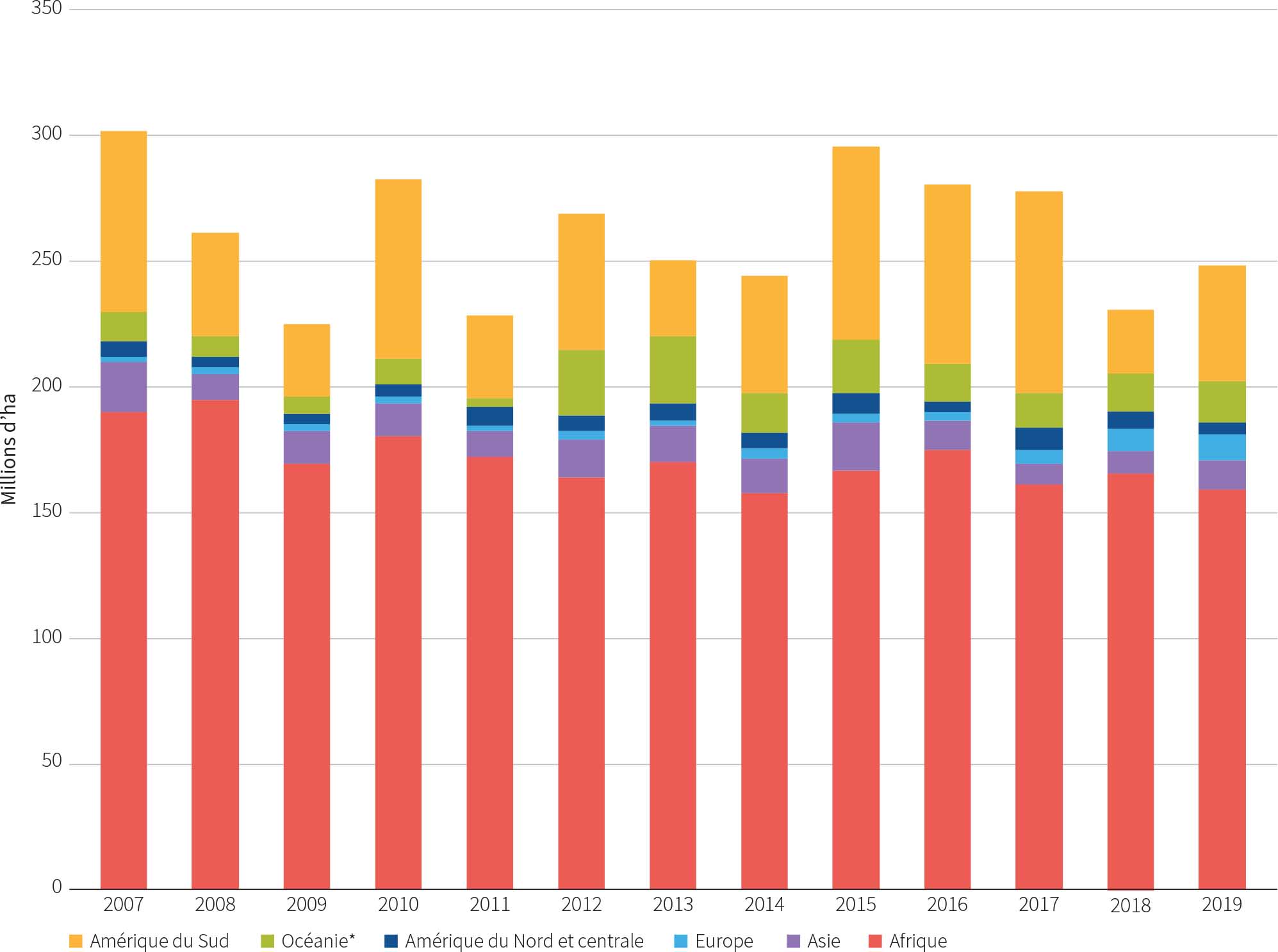 Pour l’Évaluation des ressources forestières mondiales 2025, des données provenant de 152 pays et territoires représentant près de 90 pour cent de la superficie totale des terres du globe ont été utilisées pour estimer la superficie des terres touchées par des incendies sur la période 2007-2019. En moyenne, 261 millions d’hectares de terres ont été touchés chaque année. La plus grande valeur a été enregistrée en 2007 (302 millions d’hectares), et la plus faible en 2009 (225 millions d’hectares) (figure 45). Les terres touchées se trouvaient pour près des deux tiers en Afrique.