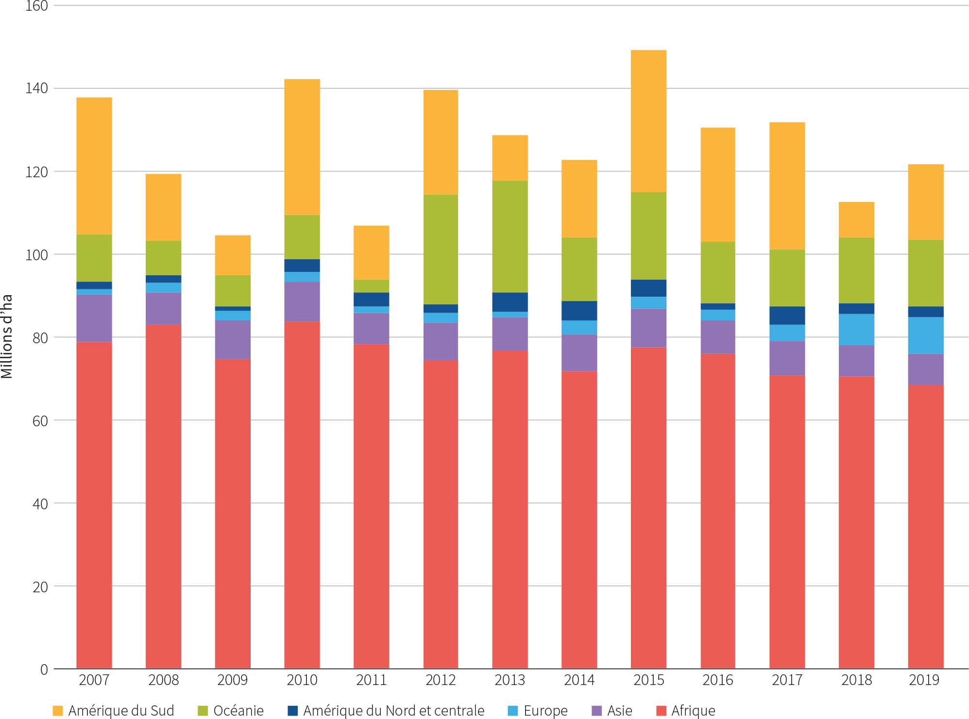 Pour éviter une interprétation erronée des tendances mondiales et régionales du fait de ces facteurs, les estimations de la superficie touchée par des incendies présentées ici se limitent à la période 2007-2019 et sont fondées sur les données communiquées par les pays et territoires qui ont fourni des séries chronologiques complètes sur les terres et/ou forêts touchées sur la totalité de la période. Les données disponibles relatives à l’Australie entre 2007 et 2021 ne concernaient que la superficie des forêts touchées (pas de données sur la superficie des terres touchées). Par conséquent, on a utilisé la superficie des forêts touchées dans le pays comme indicateur de substitution prudent lors de l’estimation des terres touchées par des incendies en Océanie.
