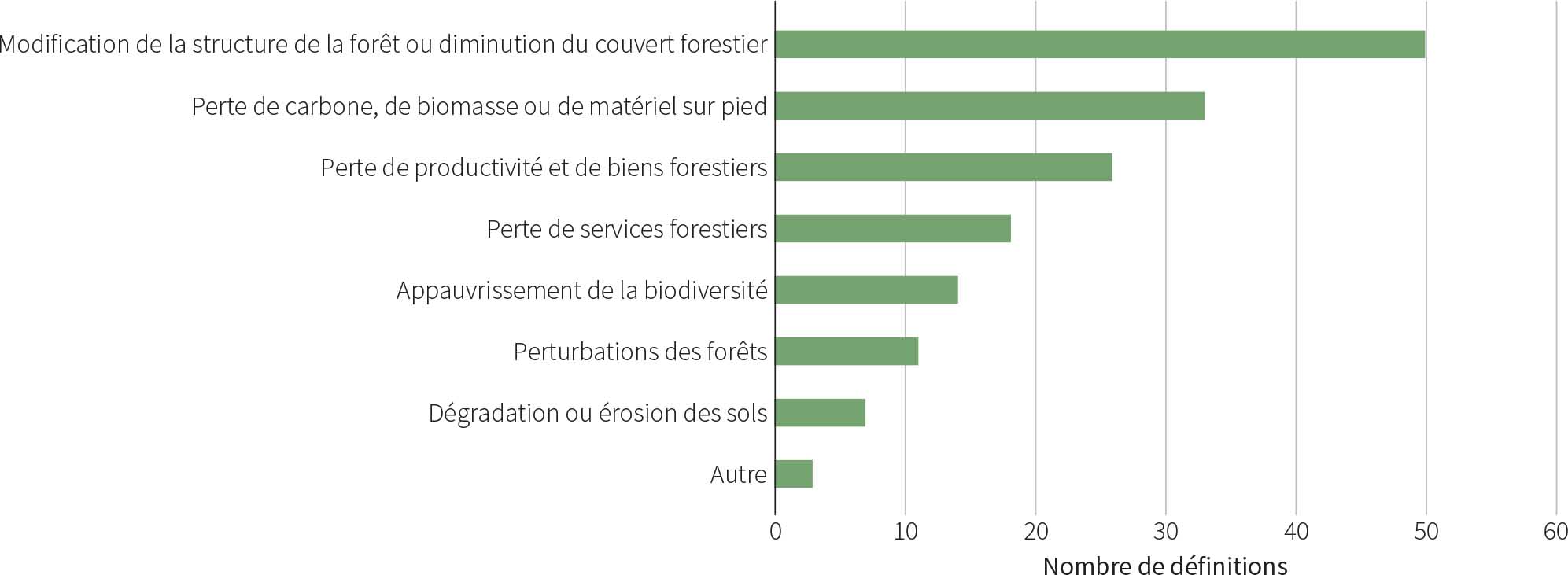 Les définitions communiquées par les pays et les territoires fournissent des indications utiles sur l’ensemble des critères retenus pour définir la dégradation des forêts. L’analyse des définitions in extenso a permis de les classer en deux principaux groupes: celui des définitions qui décrivent la dégradation en détaillant les types de perturbations des forêts à son origine (exploitation forestière illégale, incendies fréquents ou pratiques de gestion non durables, par exemple) et celui (plus important) des définitions qui décrivent la dégradation en détaillant les incidences de ces perturbations, telles que la modification de la structure des forêts, la réduction des biens et services forestiers fournis ou l’appauvrissement de la biodiversité.