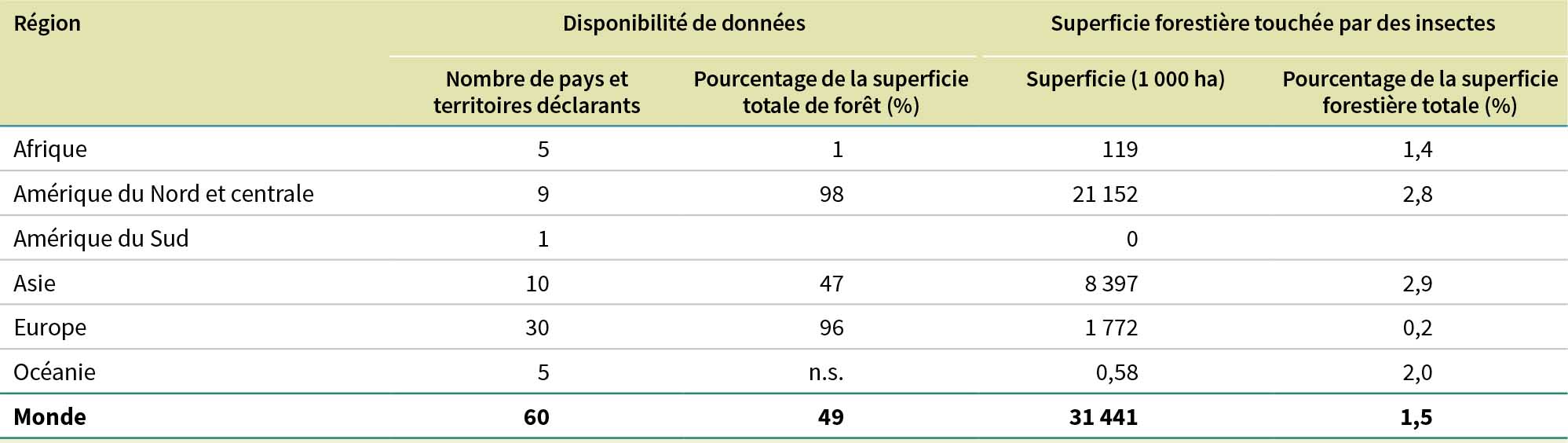 Soixante pays et territoires représentant 49 pour cent de la superficie forestière mondiale ont indiqué leur superficie forestière touchée par des insectes en 2020. La superficie totale touchée s’élevait à 31,4 millions d’hectares, soit 2 pour cent environ de la superficie forestière totale des pays et territoires ayant communiqué des données (tableau 81). Les rapports les plus complets ont été fournis par l’Amérique du Nord et centrale (98 pour cent de la superficie forestière de la région couverte), suivie de l’Europe (96 pour cent) et de l’Asie (47 pour cent). L’Afrique, l’Océanie et l’Amérique du Sud n’ont communiqué que très peu de données. La région qui a présenté la plus grande superficie forestière touchée par des insectes en 2020 était l’Amérique du Nord et centrale (21,2 millions d’hectares), suivie de l’Asie (8,40 millions d’hectares). Dans ces deux régions, près de 3 pour cent de la superficie forestière totale des pays ayant communiqué des données a été infestée par des insectes.
