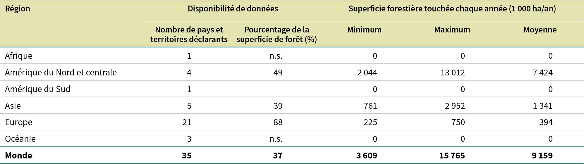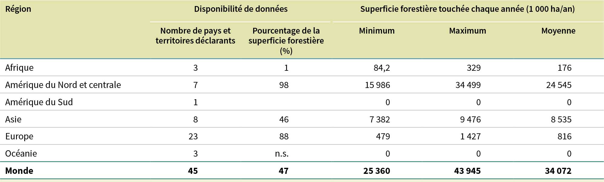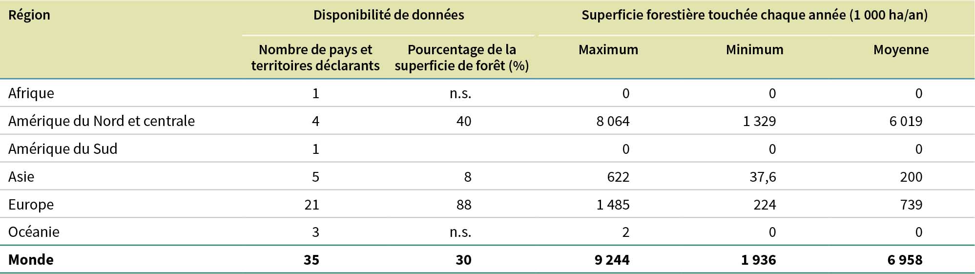 Dans certaines régions, des données largement incomplètes ont été communiquées s’agissant des catégories de dommages (certains rapports ne fournissaient de données que sur une seule catégorie de perturbations, par exemple) et des années couvertes. Afin de fonder l’examen sur les données les plus représentatives, l’année 2020 a été retenue comme référence pour l’évaluation de la situation en matière de dommages, et l’analyse des tendances a été réalisée sur la période 2002-2020. Compte tenu des données incomplètes, il n’a pas été possible d’estimer la superficie forestière totale touchée par des perturbations à l’échelle mondiale.