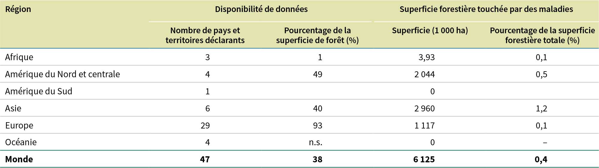 Quarante-sept pays et territoires représentant 38 pour cent de la superficie forestière mondiale ont indiqué leur superficie forestière touchée par des maladies en 2020. La superficie totale touchée s’élevait à 6,13 millions d’hectares, soit 0,4 pour cent de la superficie forestière des pays et territoires ayant communiqué des données (tableau 83). Les pays et territoires européens qui ont communiqué des informations sur cet aspect représentaient 93 pour cent de la superficie forestière de la région; venaient ensuite, par superficie décroissante, l’Amérique du Nord et centrale (49 pour cent) et l’Asie (40 pour cent).