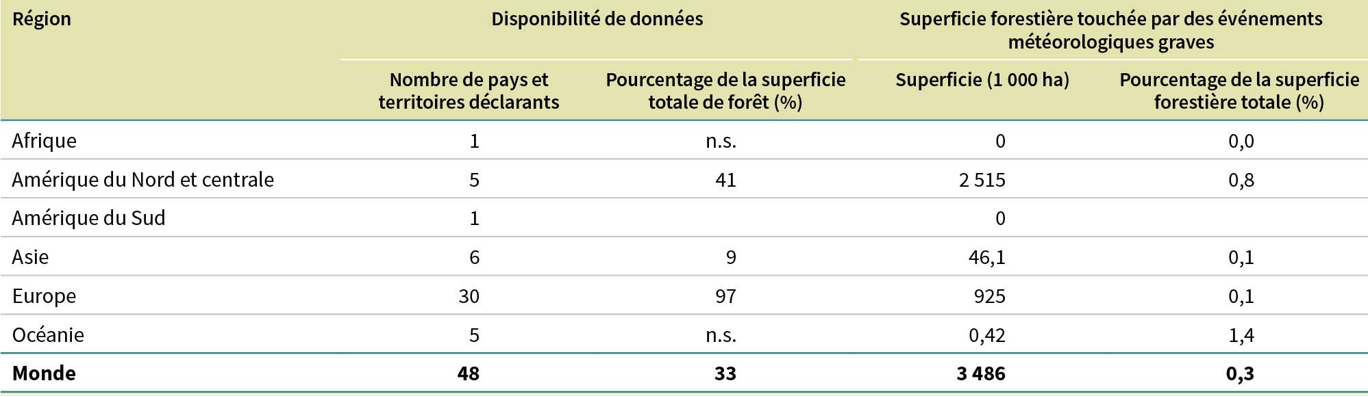Quarante-huit pays et territoires représentant 33 pour cent de la superficie forestière mondiale ont indiqué leur superficie forestière touchée par des événements météorologiques graves en 2020. La superficie totale touchée s’élevait à 3,49 millions d’hectares, soit 0,3 pour cent de la superficie forestière des pays et territoires ayant communiqué des données.