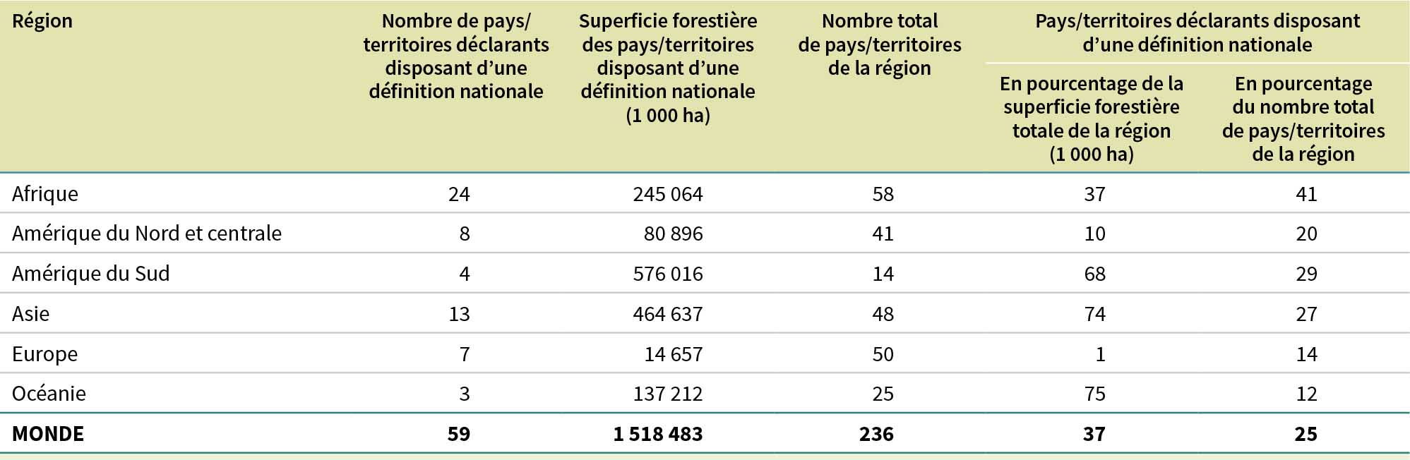 Des informations sur l’existence de définitions nationales du terme «dégradation des forêts» ont été obtenues de 214 pays et territoires représentant plus de 99 pour cent la superficie forestière mondiale. Au total, 59 pays et territoires représentant quelque 37 pour cent de la superficie forestière mondiale ont déclaré avoir une définition nationale de ce terme. La région possédant la plus grande proportion de pays et de territoires disposant d’une définition nationale officielle est l’Afrique (41 pour cent des pays et des territoires), suivie de l’Amérique du Sud (29 pour cent) et de l’Asie (27 pour cent) (tableau 87). En outre, 17 autres pays et territoires ont indiqué que, bien que ne disposant pas de définitions officielles de ce terme dans leurs juridictions, ils avaient adopté des définitions existantes provenant d’autres sources (15 pays/territoires) ou élaboré des ensembles de critères opérationnels (deux pays/territoires) à des fins de suivi.