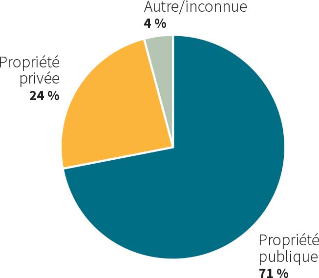 Pour l’Évaluation des ressources forestières mondiales 2025, des informations ont été recueillies sur les droits de propriété et de gestion en 1990, 2000, 2010, 2015 et 2020; 2020 est donc l’année de référence pour l’analyse de la situation. Les quatre catégories de propriété forestière suivantes ont été prises en compte: 1) propriété publique; 2) propriété privée; 3) autre forme de propriété; et 4) propriété inconnue (en raison de leur faible importance, les deux dernières catégories sont fusionnées – sous la dénomination «autre forme de propriété/propriété inconnue» – dans les données présentées ici). La catégorie «propriété privée» comporte trois sous-catégories: 1) forêt appartenant à des particuliers; 2) forêt appartenant à des entités ou des institutions commerciales privées; 3) forêt appartenant à des communautés locales ou des peuples autochtones.