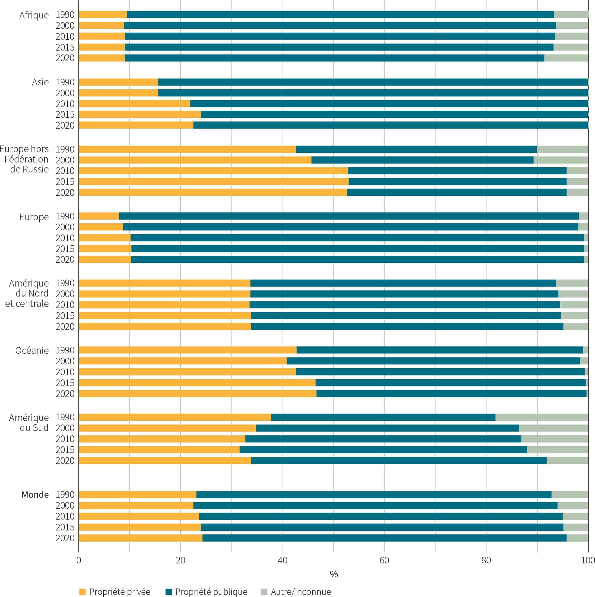 À l’échelle mondiale, la part de la superficie forestière totale classée dans la catégorie «autre forme de propriété/propriété inconnue» a diminué entre 1990 et 2020, ce qui indique un renforcement de la clarté en matière de régimes de propriété. Les proportions de forêts publiques comme privées ont augmenté légèrement sur la période. On constate de nettes divergences régionales: pendant la période, la part des forêts publiques, par exemple, a diminué en Afrique, en Asie, en Europe et en Océanie, et a progressé en Amérique du Nord et centrale ainsi que, dans une plus large mesure, en Amérique du Sud. La proportion de forêts privées a reculé en Amérique du Sud (de 38 pour cent en 1990 à 34 pour cent en 2020), essentiellement à cause du Brésil, qui a vu sa superficie de forêts privées passer de 365 millions d’hectares à 227 millions d’hectares sur la période. L’augmentation de la proportion de forêts privées constatée en Asie (de 16 pour cent en 1990 à 23 pour cent en 2020) est principalement liée à la Chine, où la superficie de forêts privées est passée de 27,5 millions d’hectares en 1990 à 76,9 millions d’hectares en 2020. La part des forêts privées a également progressé en Europe et en Océanie, et est restée relativement stable en Afrique et en Amérique du Nord et centrale. La superficie relevant de la catégorie «autre forme de propriété/propriété inconnue» a diminué pendant la période dans toutes les régions, sauf en Afrique (notamment à cause des importantes superficies déclarées comme étant sous un régime de propriété inconnu en Afrique de l’Est et australe).