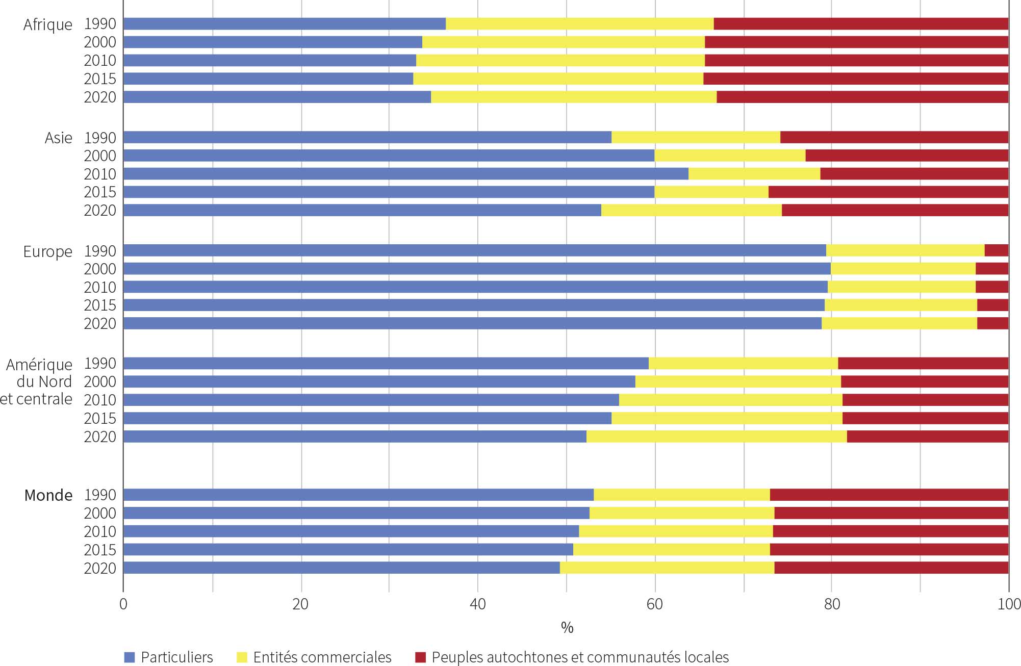 La part de la superficie forestière détenue par des peuples autochtones et des communautés locales a reculé en Amérique du Nord et centrale, passant de 19 pour cent en 1990 à 18 pour cent en 2020. Elle est restée stable en Afrique et en Asie (33 pour cent et 26 pour cent, respectivement), et a enregistré une légère hausse en Europe (de 3 pour cent à 4 pour cent).