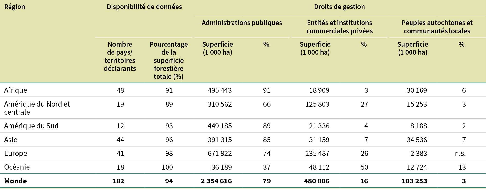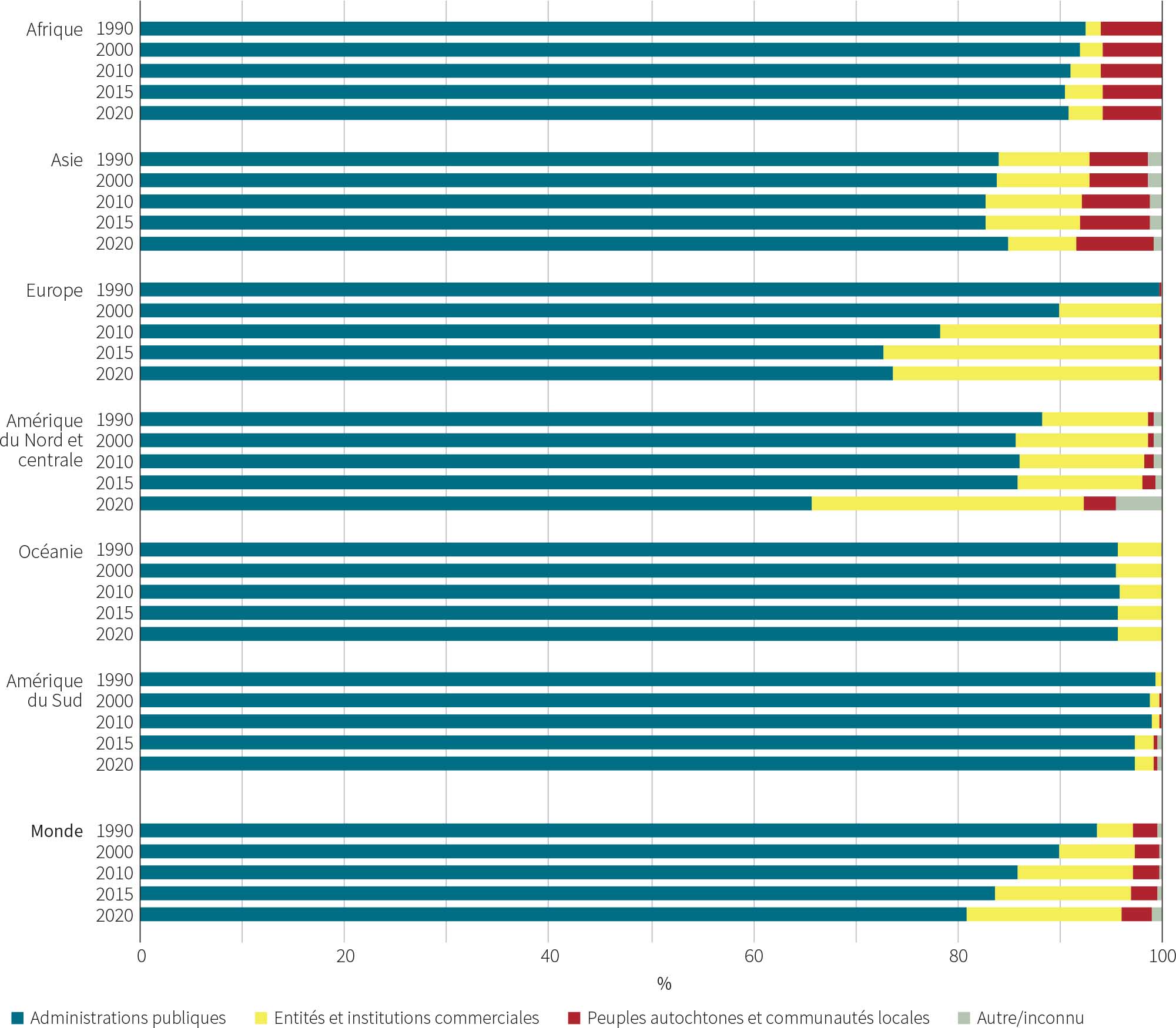 Les administrations publiques détenaient 79 pour cent des droits de gestion des forêts publiques dans le monde en 2020, contre 16 pour cent pour les entités et institutions commerciales privées et 3 pour cent pour les peuples autochtones et les communautés locales (tableau 80). Les 2 pour cent restants entraient dans la catégorie «autre/inconnu» (détenteurs mixtes, principalement).