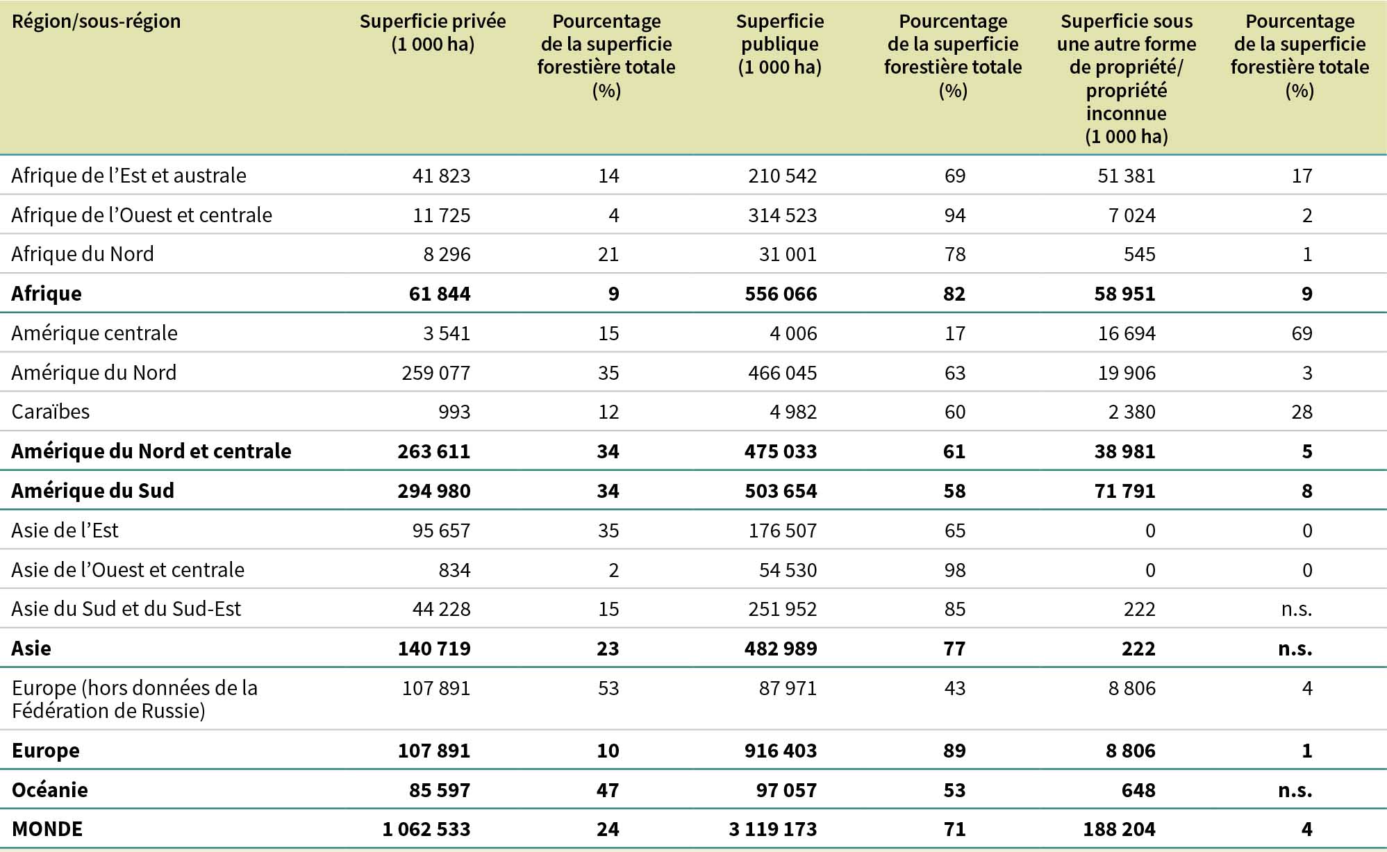 Quatre-vingt-dix pays et territoires (dont 71 en Afrique et en Asie) ont déclaré que plus de 90 pour cent de leurs forêts étaient sous propriété publique en 2020. Cinq pays et territoires (tous en Océanie) ont indiqué que la totalité de leurs forêts étaient privées (tableau 78).
