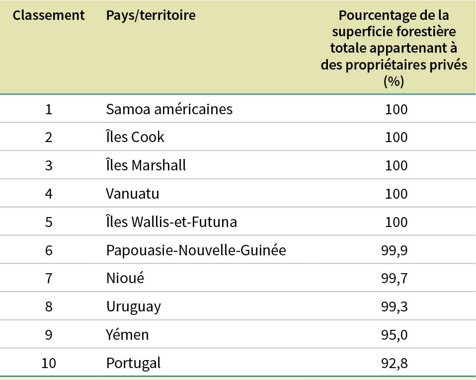Sur la superficie totale de forêts privées en 2020, 48 pour cent étaient détenues par des particuliers, 30 pour cent par des peuples autochtones et des communautés locales, et 23 pour cent par des entités et institutions commerciales privées (tableau 79).
