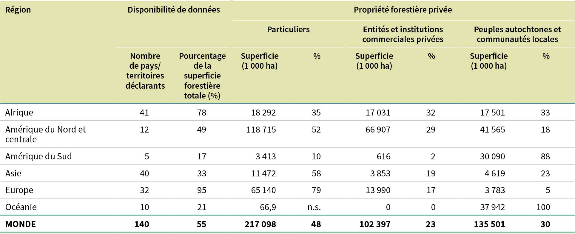 Les particuliers étaient les plus nombreux parmi les propriétaires en Europe (79 pour cent de la superficie forestière privée totale), en Asie (58 pour cent) et en Amérique du Nord et centrale (52 pour cent). Les peuples autochtones et les communautés locales détenaient 33 pour cent des forêts privées en Afrique, 23 pour cent en Asie, 18 pour cent en Amérique du Nord et centrale et 5 pour cent en Europe.