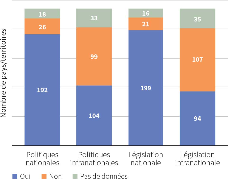 Parmi les 236 pays et territoires, quelque 40 pour cent (98 pays et territoires) ont indiqué qu’ils n’avaient pas encore mis en place d’instruments infranationaux pour gérer durablement les forêts. Certains pays et territoires (le Guyana et Madagascar, par exemple) ont indiqué que des politiques et des lois favorisant une gestion durable des forêts étaient élaborées au niveau national puis appliquées aux niveaux infranational et local, tandis que d’autres (comme Singapour) ont fait savoir qu’ils ne disposaient pas d’entités infranationales.