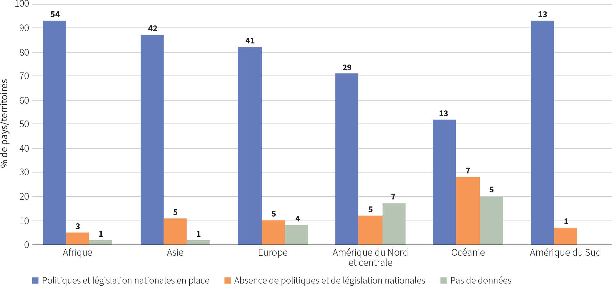 Des politiques et une législation favorisant une gestion durable des forêts sont en place dans 192 pays et territoires qui représentent plus de 95 pour cent de la superficie forestière mondiale (figure 49). La proportion la plus importante de pays et de territoires indiquant que de telles politiques et législations nationales sont en place dans le secteur des forêts se trouve en Afrique, en Asie et en Amérique du Sud, à savoir environ 90 pour cent pour chacune de ces régions (54 pays et territoires en Afrique, 42 en Asie et 13 en Amérique du Sud), ce qui représente 48 pour cent environ de la superficie forestière mondiale (figure 50). Ce résultat s’explique probablement en partie par les activités entreprises ces dernières décennies pour élaborer des politiques et des lois qui formalisent et prennent mieux en compte les pratiques coutumières dans les textes réglementaires. Il peut également être le fruit des efforts qui ont visé à intégrer les nouvelles questions, telles que le changement climatique et le genre, dans les politiques et les lois en vue de renforcer la gestion durable des forêts et de respecter les engagements internationaux relatifs à ces dernières.