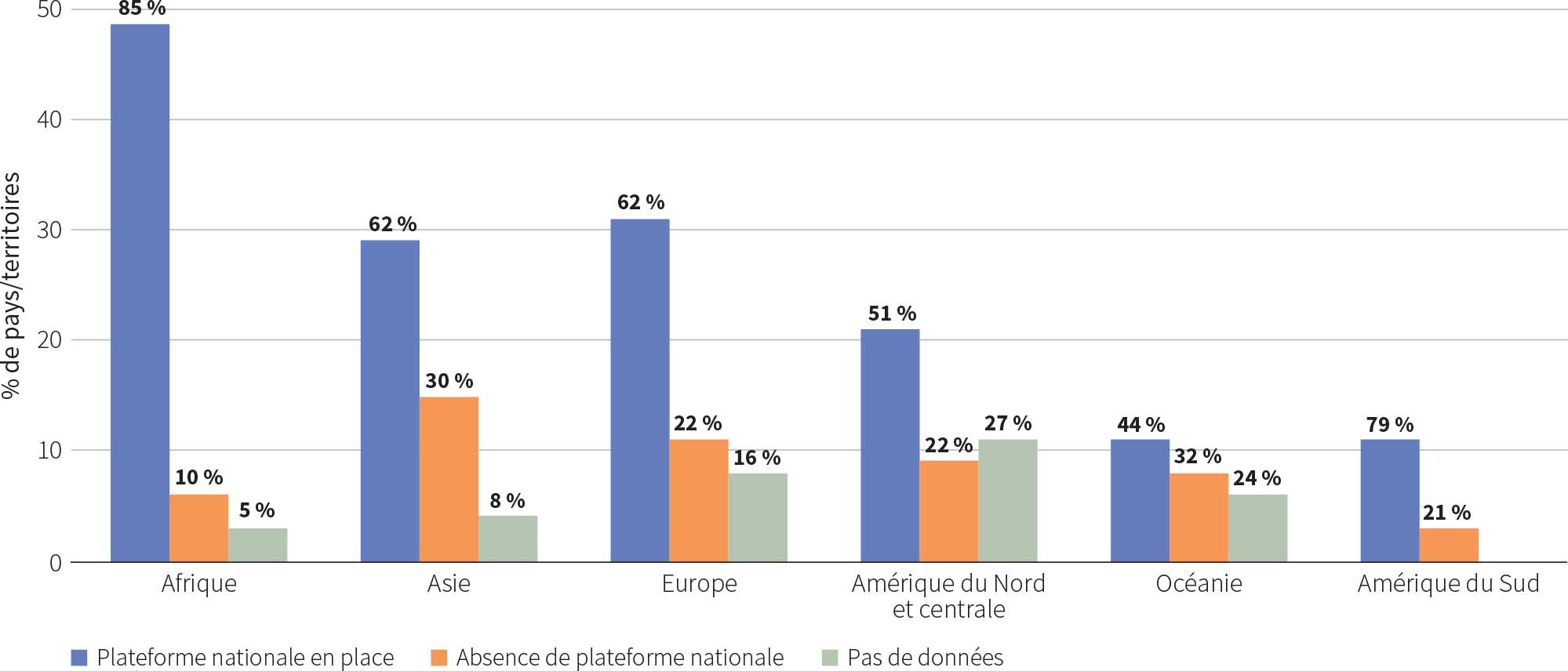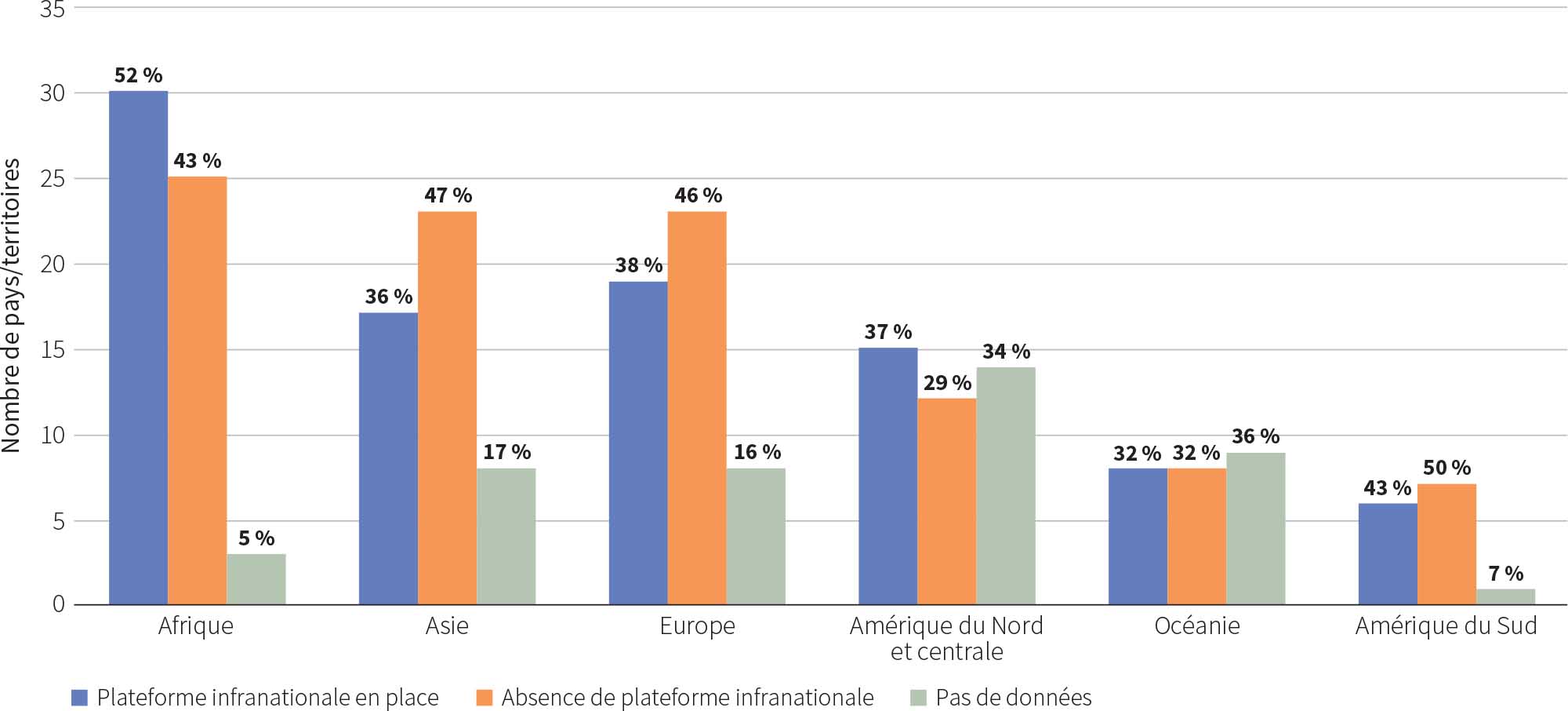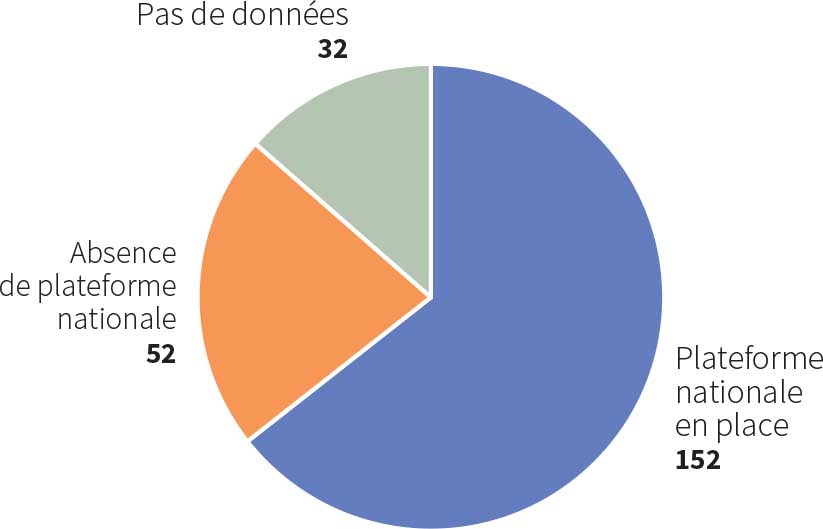 Sur les 236 pays et territoires qui ont communiqué des données pour l’Évaluation des ressources forestières mondiales 2025, 64 pour cent (152 pays et territoires représentant presque 95 pour cent des forêts du monde) ont indiqué qu’ils disposaient d’une plateforme nationale permettant aux parties prenantes de participer à l’élaboration des politiques (figure 51); c’était le cas notamment pour 85 pour cent des pays et territoires répondants d’Afrique (figure 52). Quelque 40 pour cent des pays et territoires (95 au total) ont indiqué qu’ils disposaient de plateformes infranationales, notamment 52 pour cent des pays et territoires répondants d’Afrique, 43 pour cent de ceux d’Amérique du Sud et 32 à 38 pour cent dans les autres régions (figure 53). Certains pays et territoires ont précisé que, en l’absence de plateforme officielle pour encourager la participation des parties prenantes du secteur forestier, les institutions compétentes collaboraient avec un large éventail d’acteurs par différents canaux pour éclairer les politiques forestières nationales (élaboration participative du Plan national de restauration des forêts au Paraguay, par exemple).